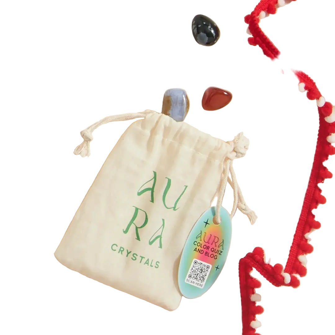 Aura Crystals is an interactive bagged collection of 5 crystals curated to amplify one’s aura, featuring a QR code to scan for a “Find Your Aura Colors” quiz and blog.