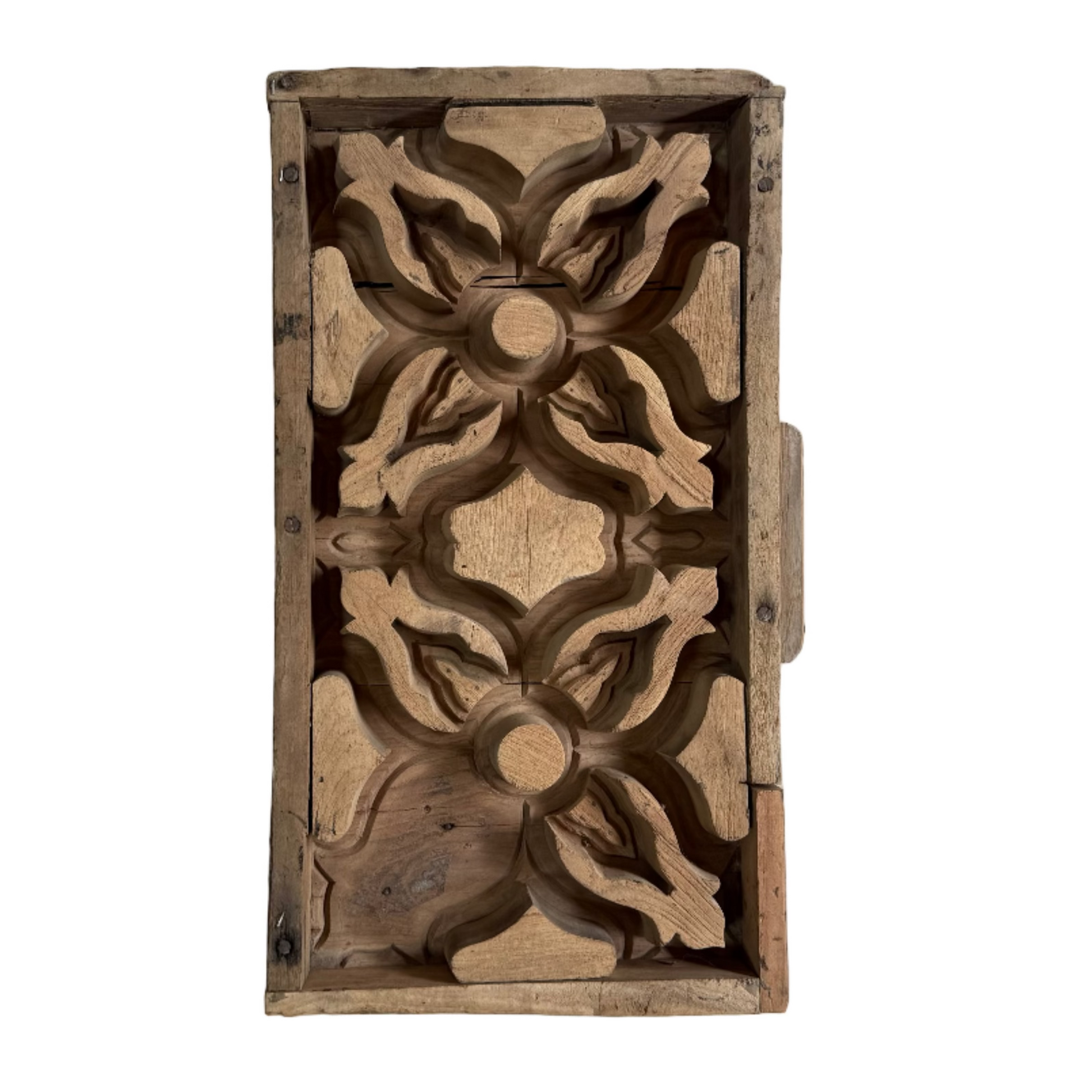 Architectural style in India is known for its decorative enhancements. The rectangle -shaped Bleached Concrete Mold is a vintage wood casing that was once used in the construction of buildings in India. Each mold has its own decorative style and is lightly sand blasted and bleach finished to create an inspired decorative display. Hang several Bleached Concrete Molds together for maximum effect.