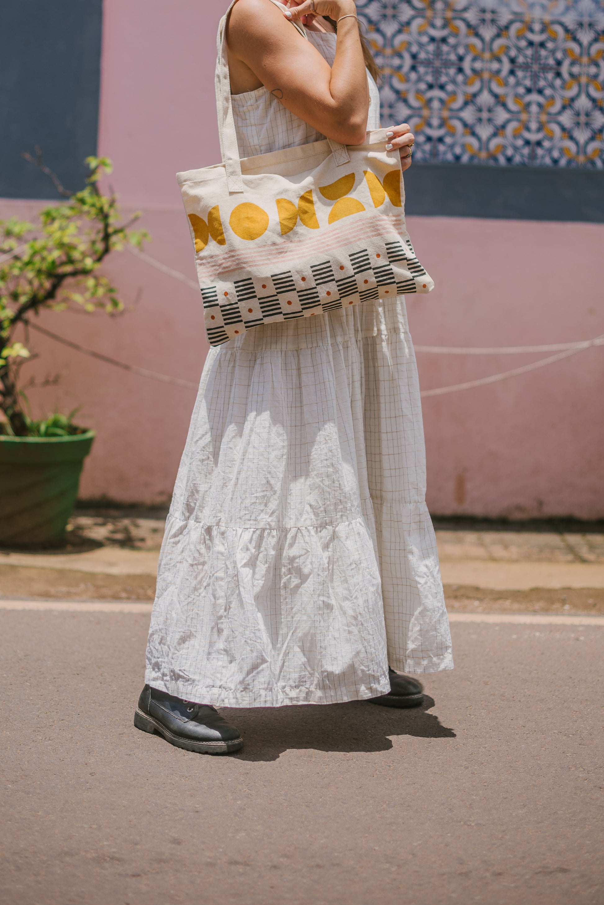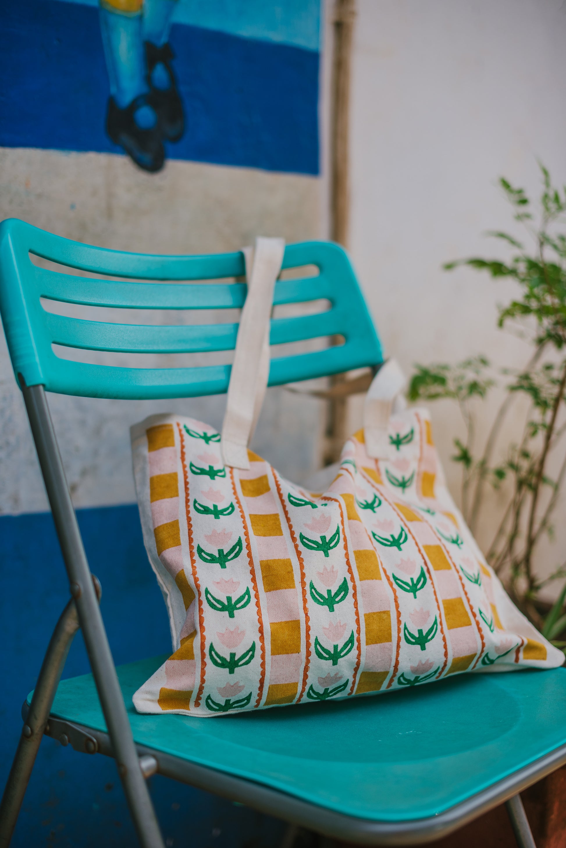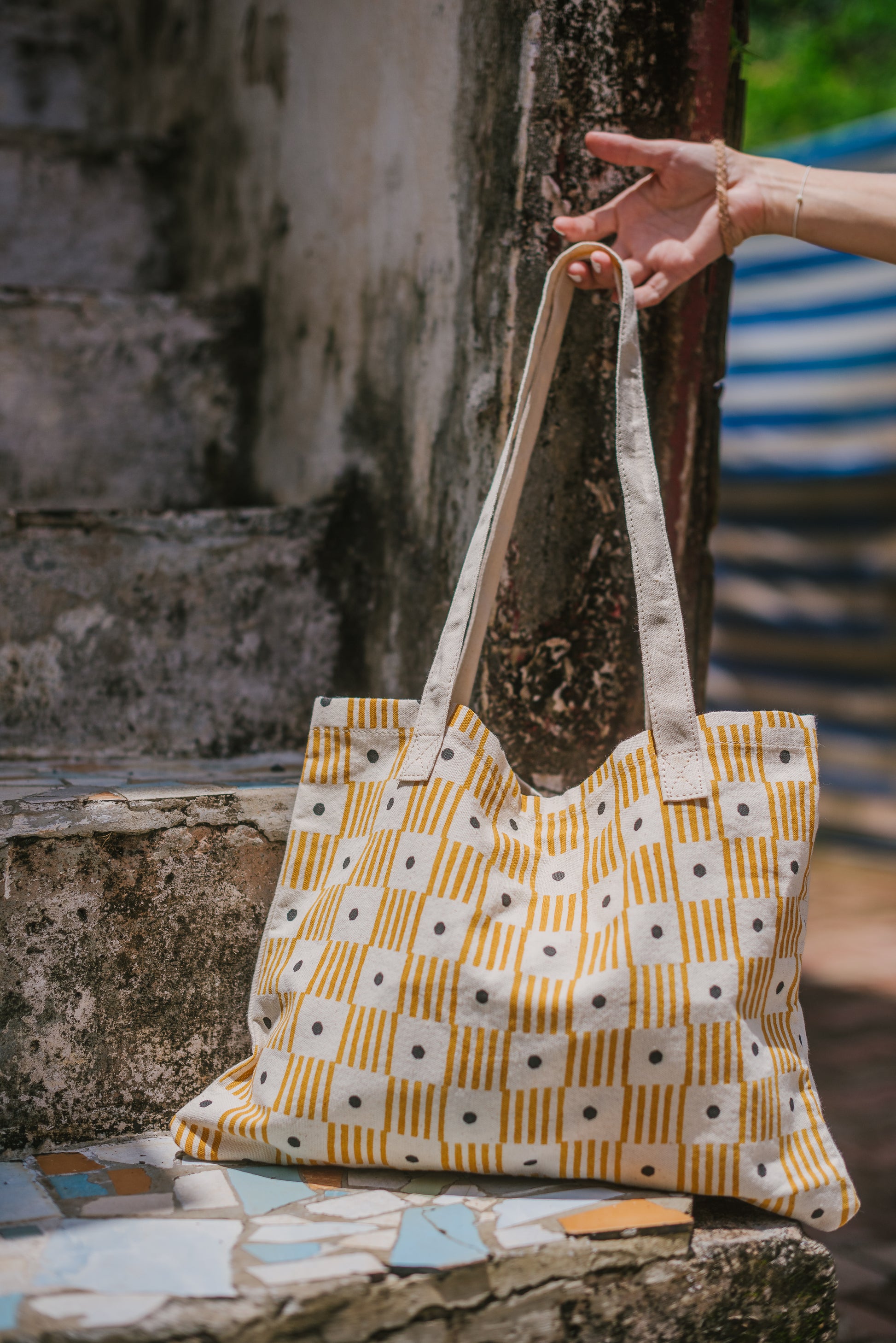 - One handcrafted cotton tote bag designed for everyday use (13.5 x 15.5”, handle drop length - 10”).