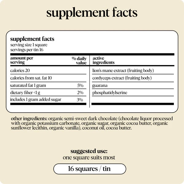 Enjoy one square of brainstorm daily in the morning or afternoon for an instant boost of natural energy + focus. Know that you are working to regrow your brain with everyday use.