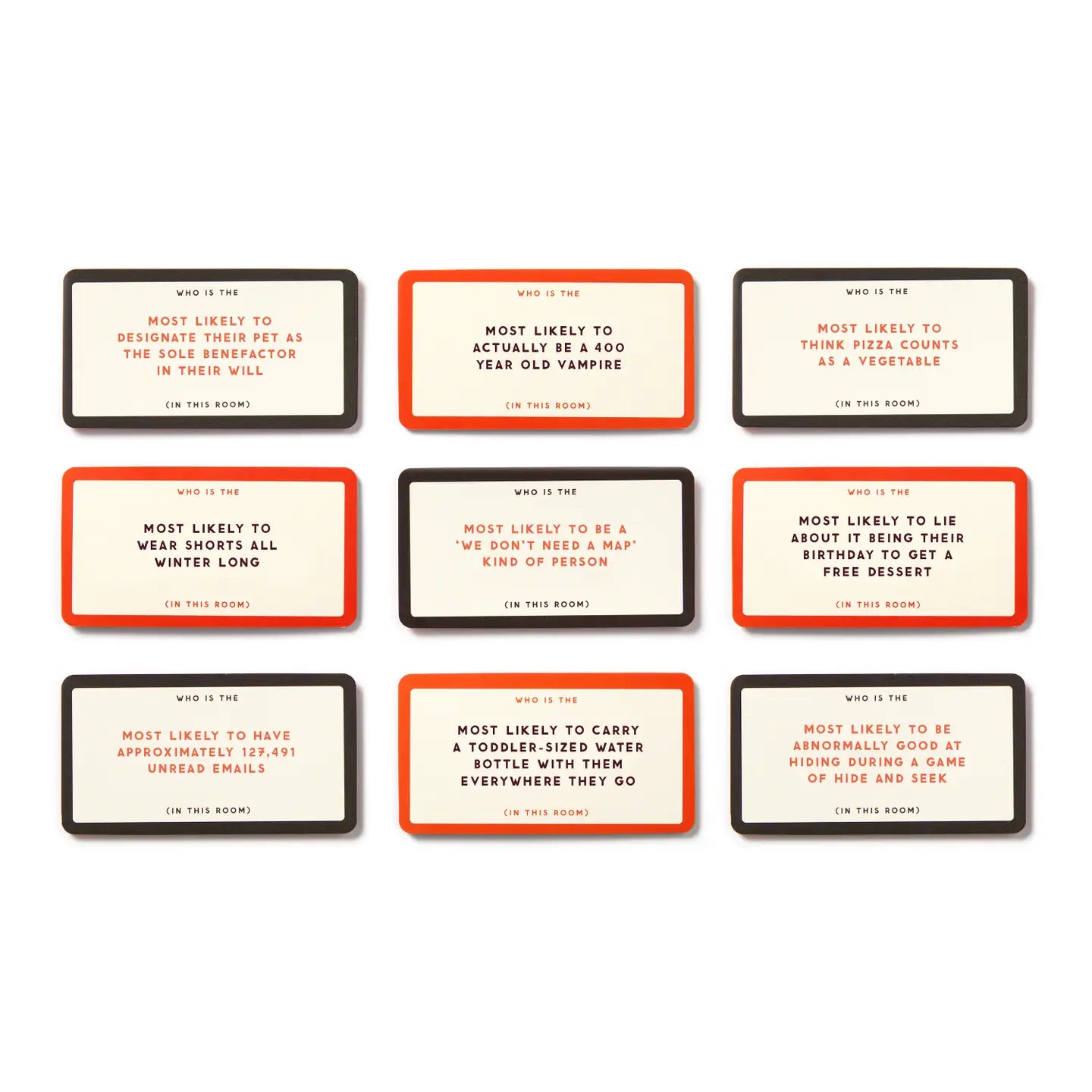 HOW TO PLAY - Who among your friend group would be the most likely to cry genuine tears just from watching a sappy commercial? Players secretly vote, and the card is awarded to person with the most votes. In the end, the player who collects the most cards is declared the winner–relatively speaking anyway.