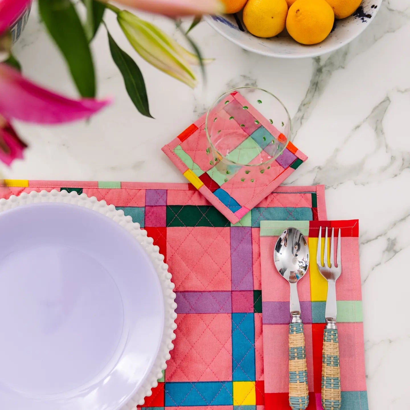 Make your meals extra festive with our exclusive screen print napkins. Handmade in India , the charming color combo and the striped trim make a bold statement. By opting for sustainable table linens over disposable, we can help cut down on waste and support an age-old craft by artisans in Jaipur.