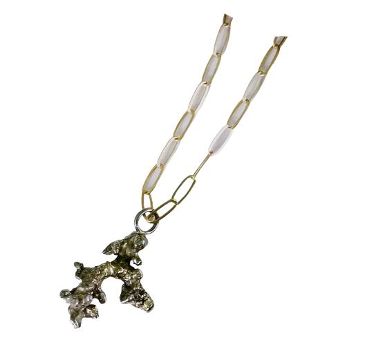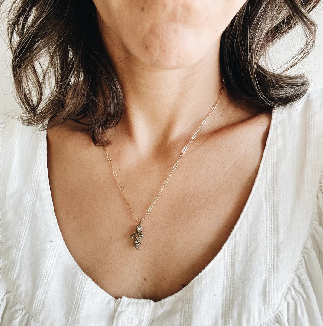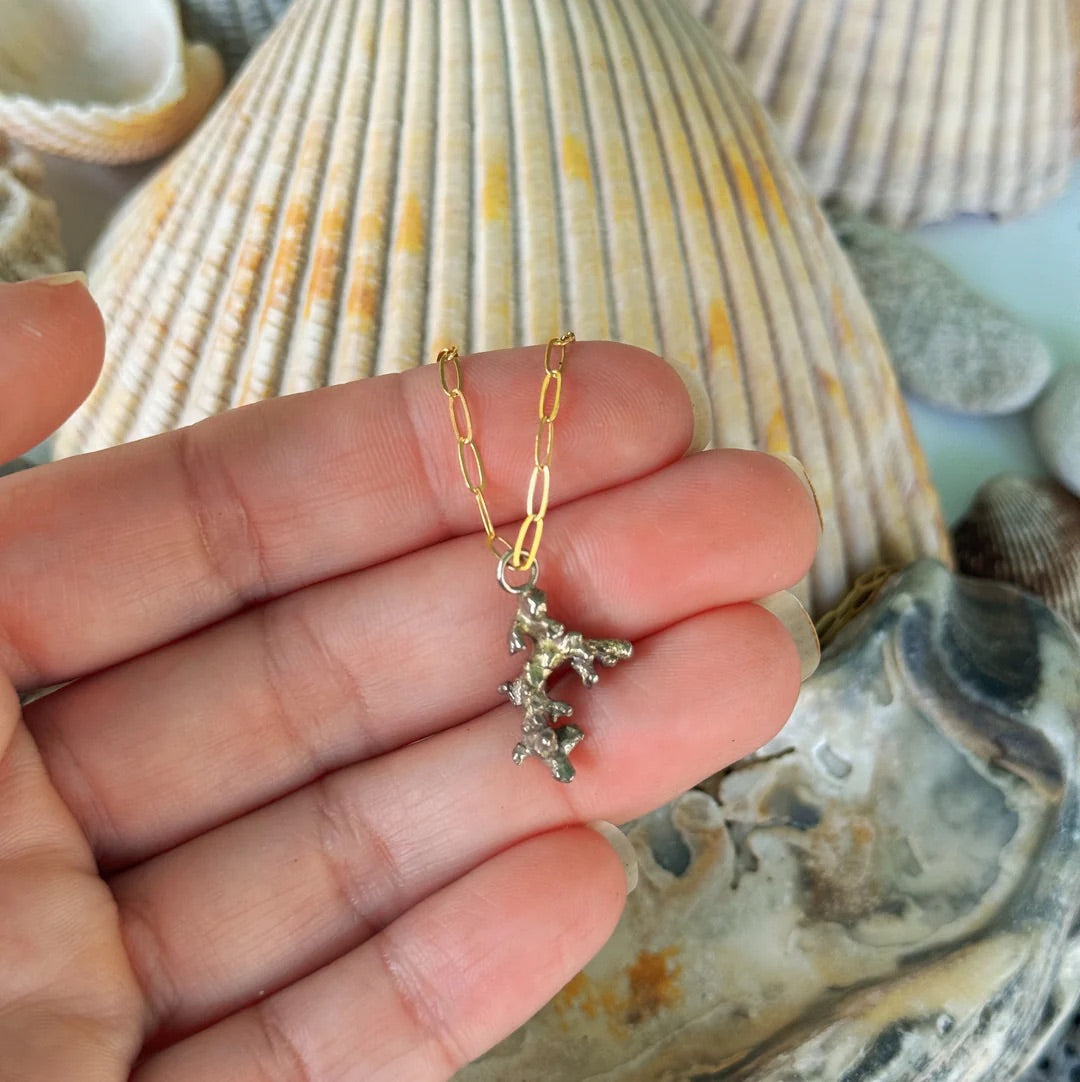 <> A white bronze cast coral specimen, found on a local beach, rests on dainty 14k gold fill paperclip chain. Simple and perfect for layering.