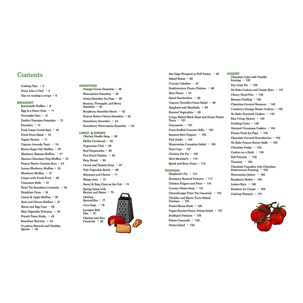 Plus, Kids in the Kitchen Tips ensure that cooking is safe and fun. Includes a glossary of cooking terms and instructions for using a knife, following a recipe, and dressing like a chef. With playful four color illustrations throughout, this is an essential kids' hardcover cookbook.
