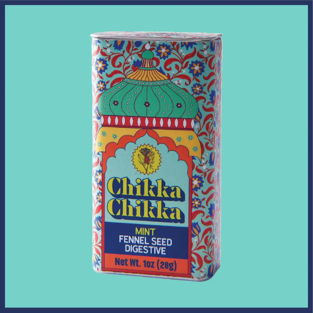 MINT 1 ounce reusable tin of their Chikka Chikka digestive snack made from a mix of fennel seeds, split coriander seeds, peppermint and spirulina lightly roasted with a touch of maple syrup. Helps freshen breath, improve digestion, and stave off hunger.