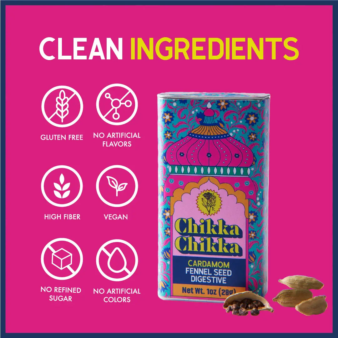 CARDAMOM 1 ounce reusable tin of their Chikka Chikka digestive snack made from a mix of fennel seeds, split coriander seeds, and freshly ground cardamom lightly roasted with a touch of maple syrup. Helps freshen breath, improve digestion, and stave off hunger.