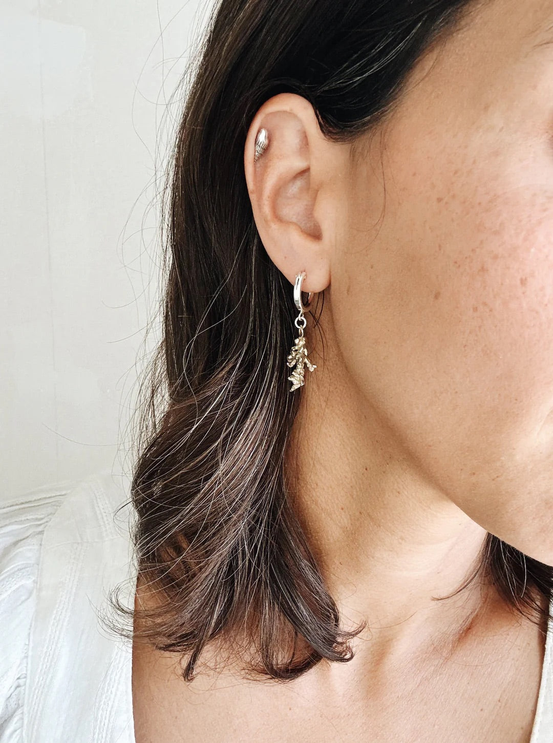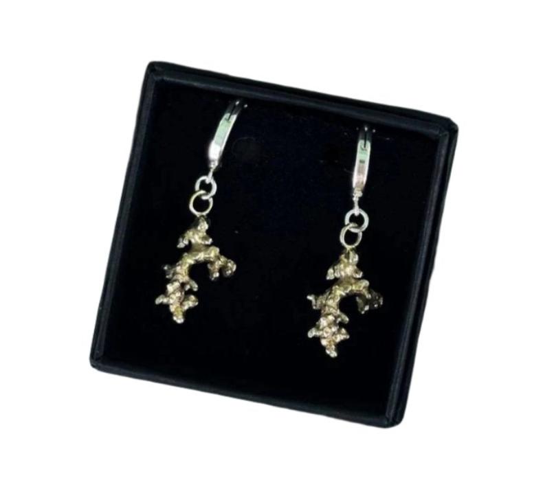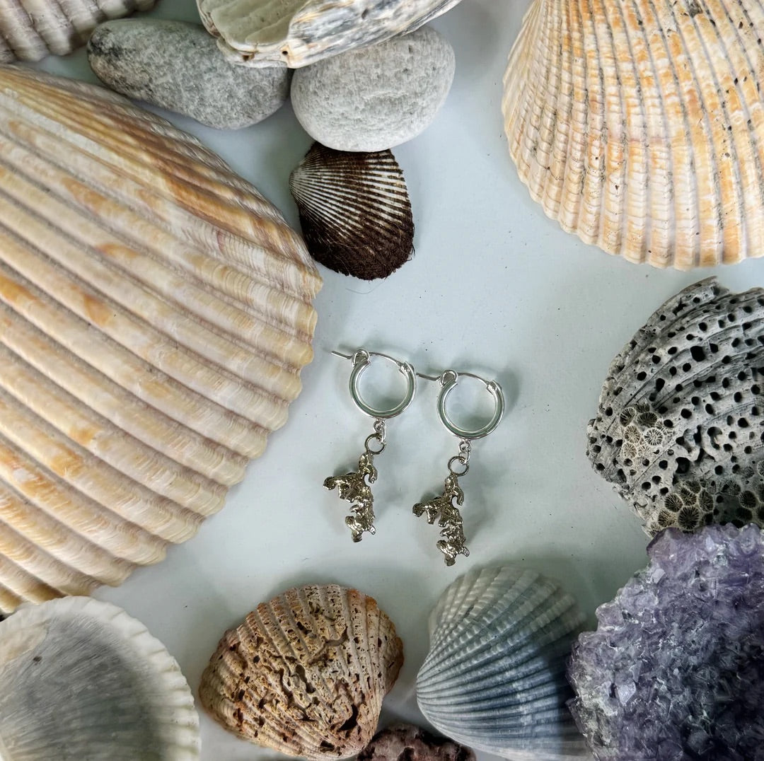 <> Featuring white bronze cast coral specimens found on local shores. The huggie style hoops are sterling silver and circle the ear from front to back with a hinged sterling silver post that clicks securely into a catch for fast, easy and secure closure. These earrings measure approximately 1.5 inches in length from top post to bottom of coral.