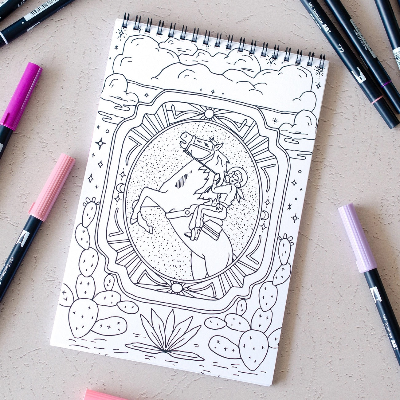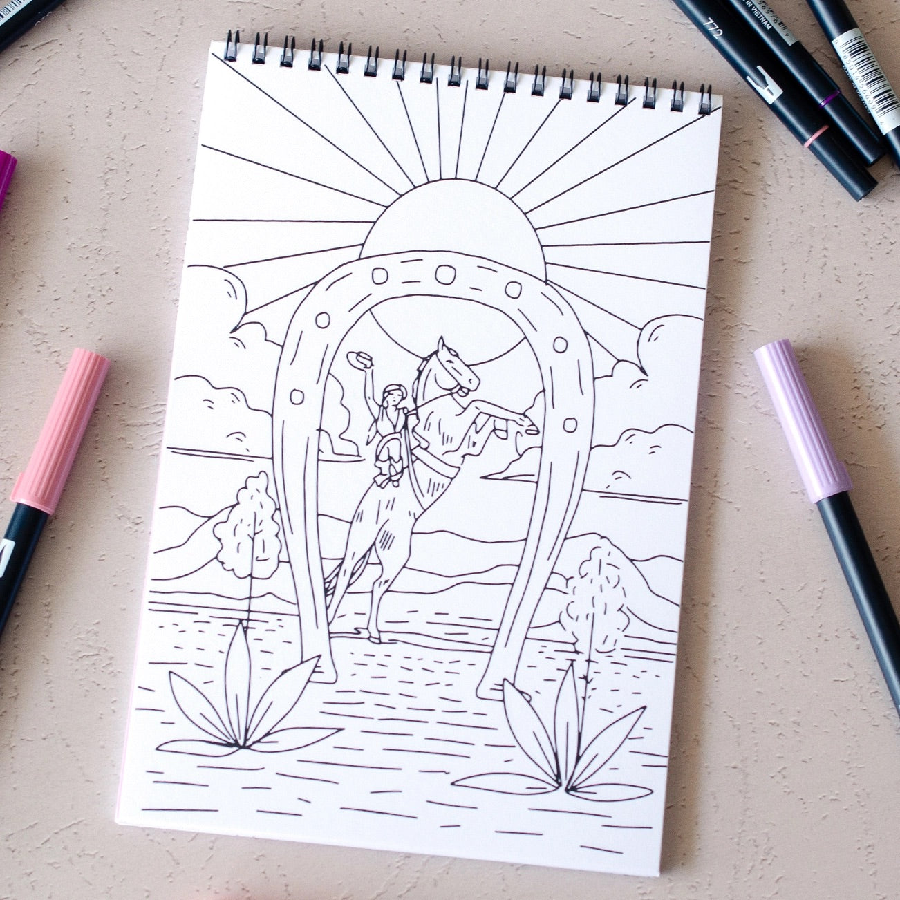 Embark on a creative journey where the wild west meets the cosmos with the Antiquaria Cosmic Cowgirl Coloring Book! This unique coloring book, proudly made in the USA and printed on premium coloring paper, features 22 pages filled with 11 imaginative illustrations of bold western landscapes and cosmic cowgirls, with 2 copies of each design.