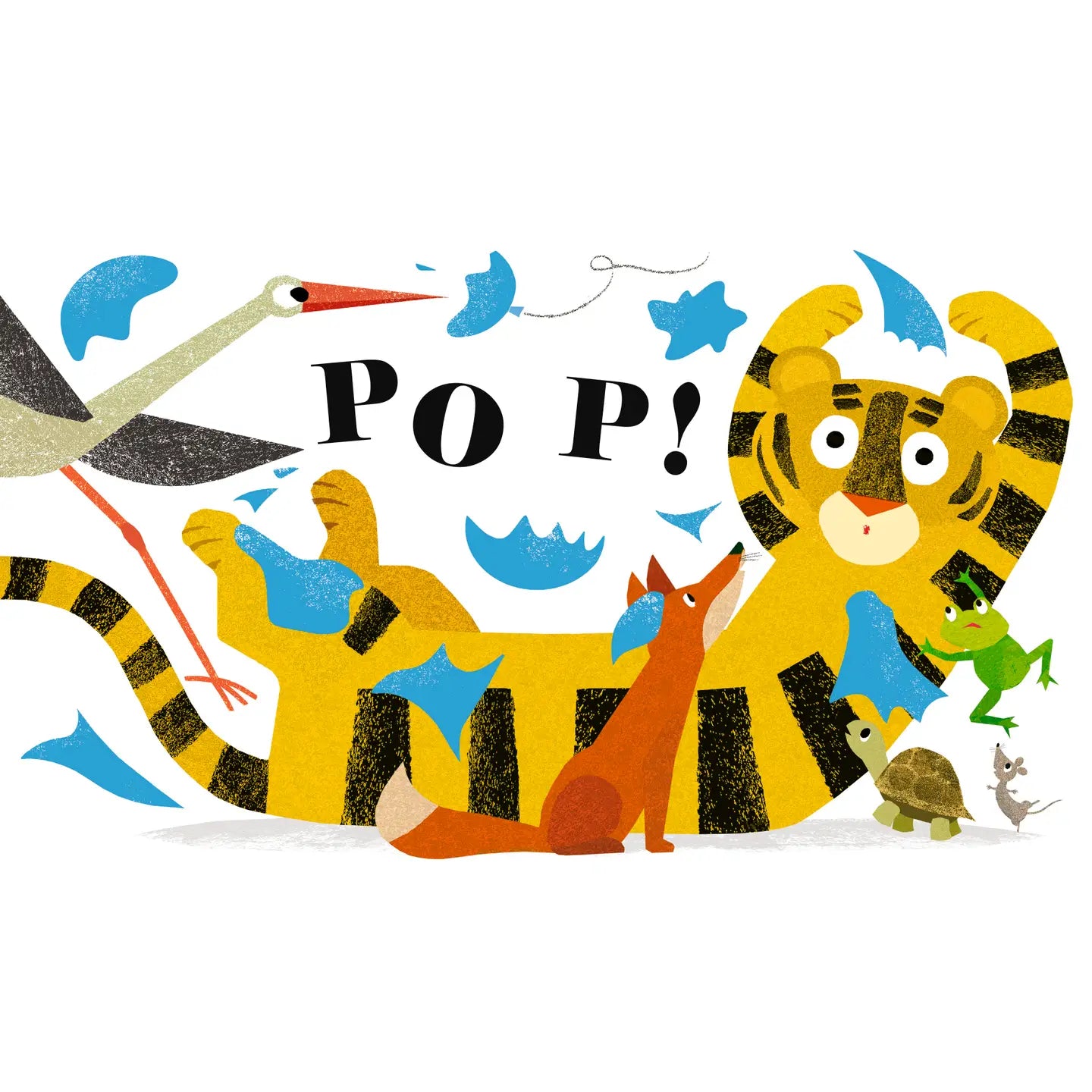 Tiger is fast asleep. But—oh dear!—she’s completely blocking the way. Just how will the animals get past without waking her up? Luckily, Frog has an excellent idea. Holding his balloon, he floats right over sleeping Tiger! Fox is next, followed by Tortoise, Mouse, and Stork, but it will be tricky for them all to get past without Tiger noticing. It’s good that the reader is there to help keep Tiger asleep. But where exactly are the animals going with all those big shiny balloons?
