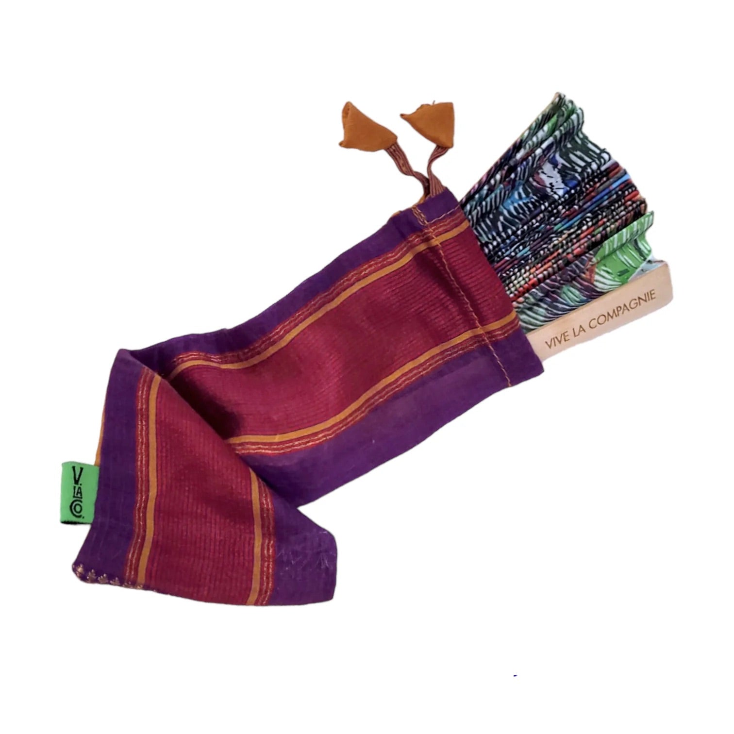When in use, the necklace cord ensures it's never far from reach. The included up-cycled sari carrying pouch keeps it clean and safe in your tote.