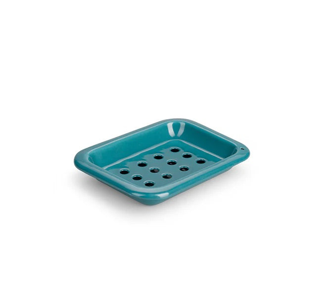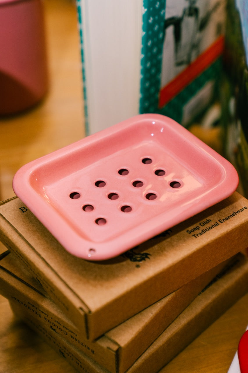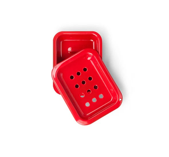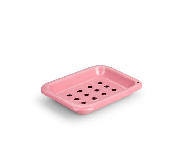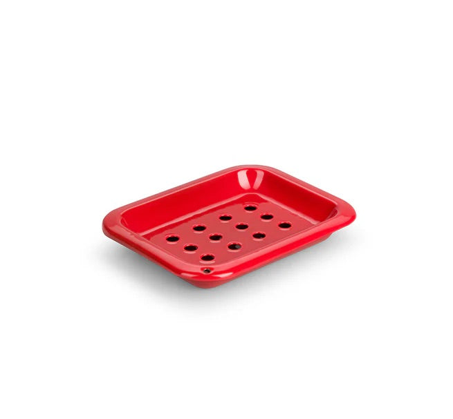 This classic enamel soap dish comes in two pieces: the holed upper section keeps soap dry, while the base catches drips and facilitates cleaning. It's crafted here in