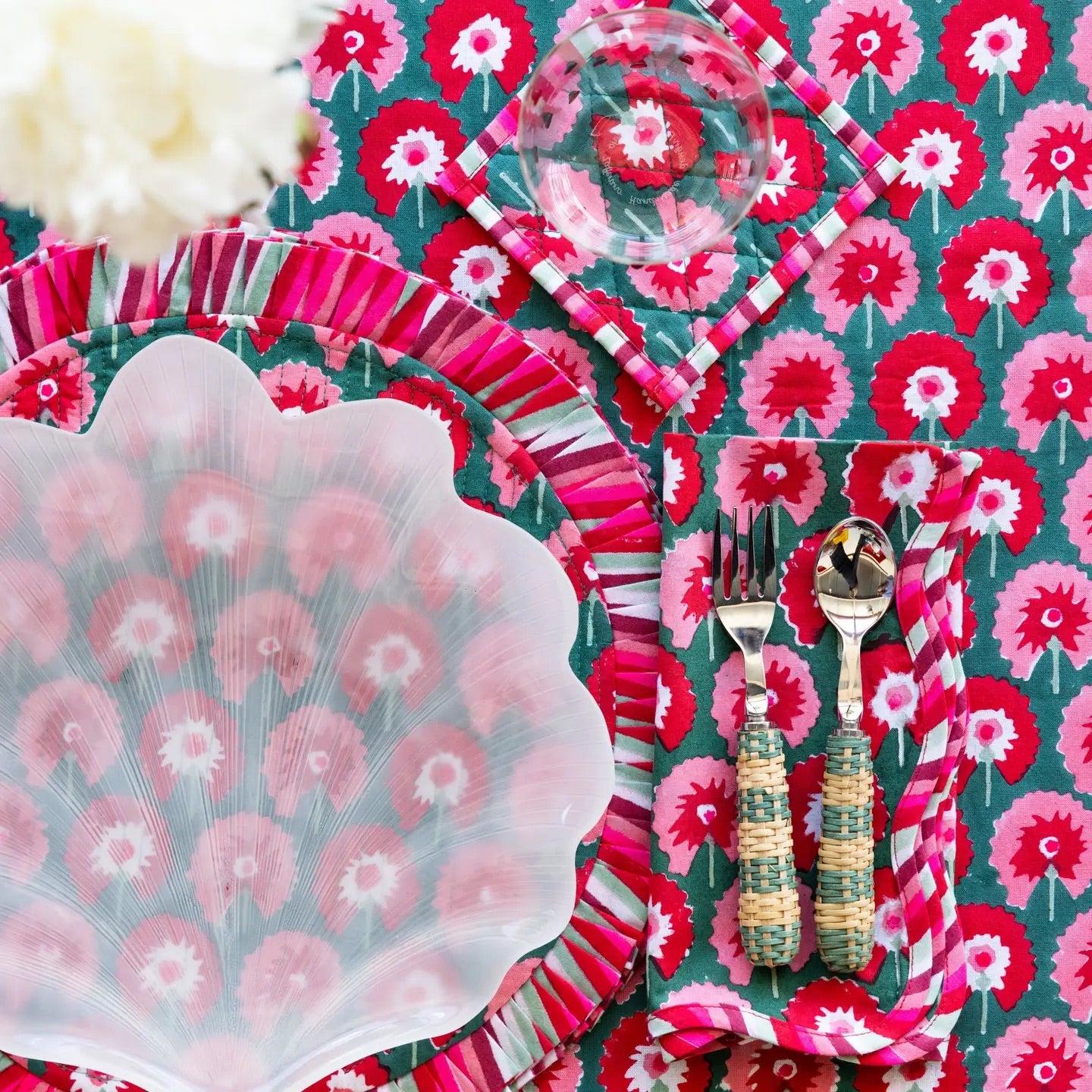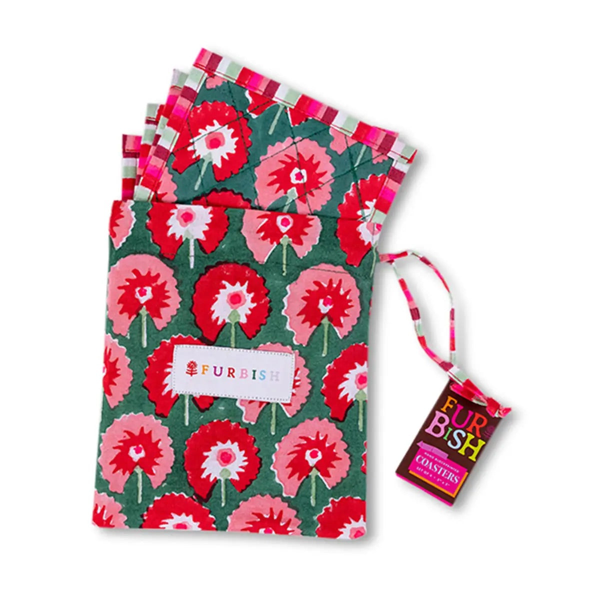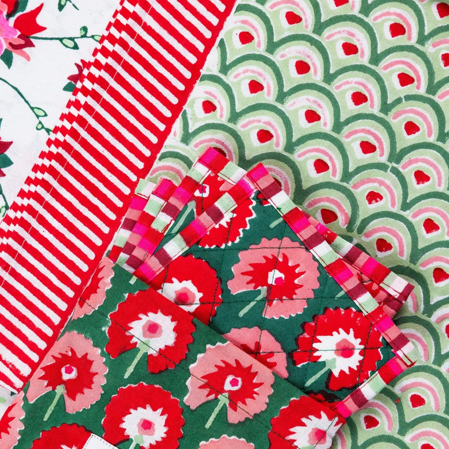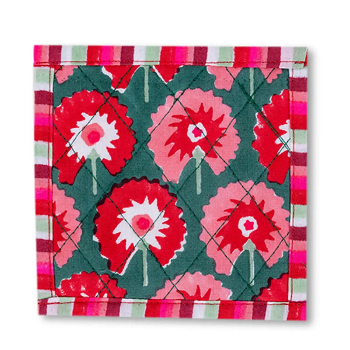 The holidays get extra festive with our exclusive blockprint quilted coasters. We love the charming color combo and the chic striped trim. Makes an excellent gift!