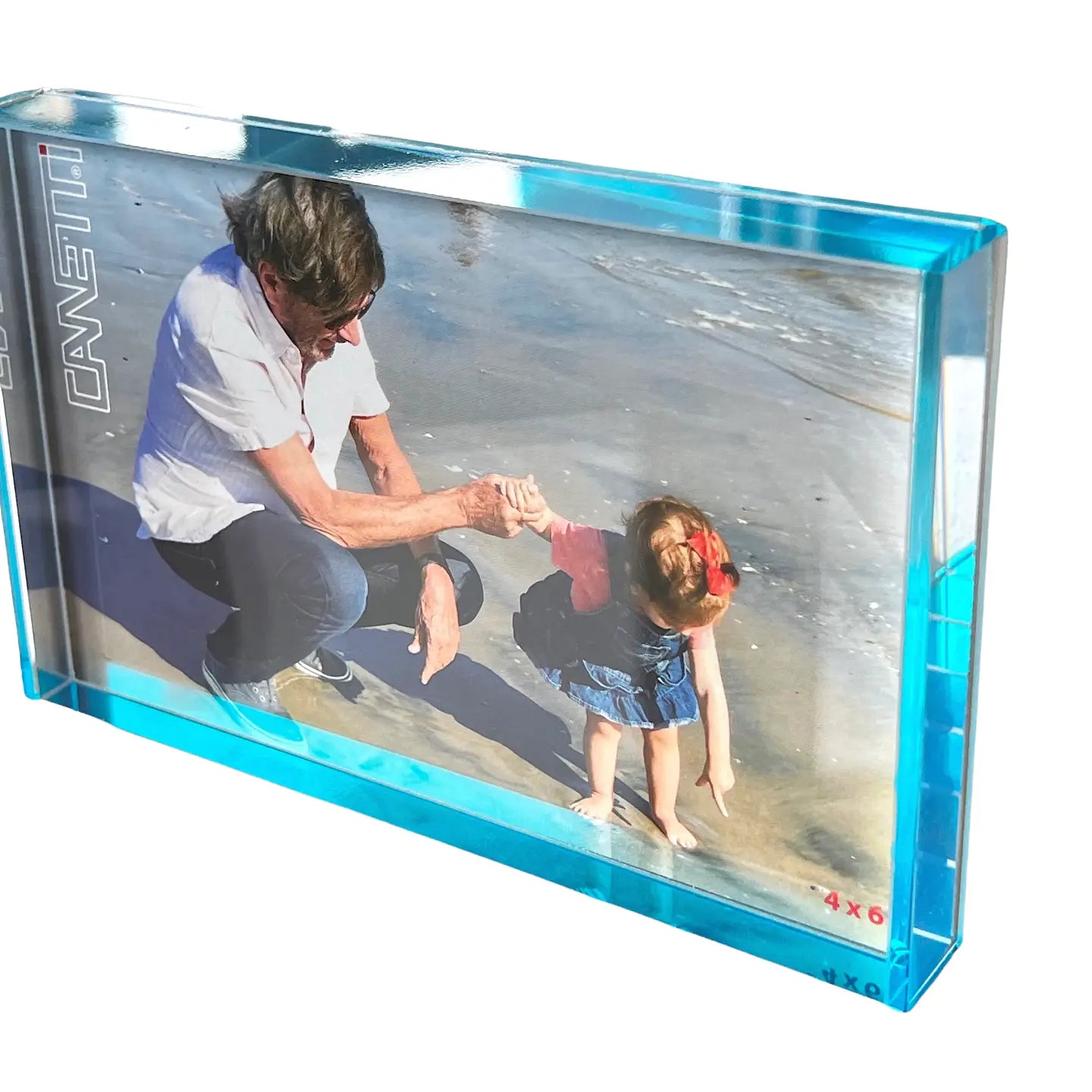 A variation of the Original Magnet Frame ®, the Color Edge Magnet Frame is made of two thick panels of crystal clear, solid acrylic accented with bright color on the edges. The two panels are held together by tiny magnet points, with the picture easily placed between the two panels and held securely without any hardware. Display 2 photos back to back, horizontally or vertically.