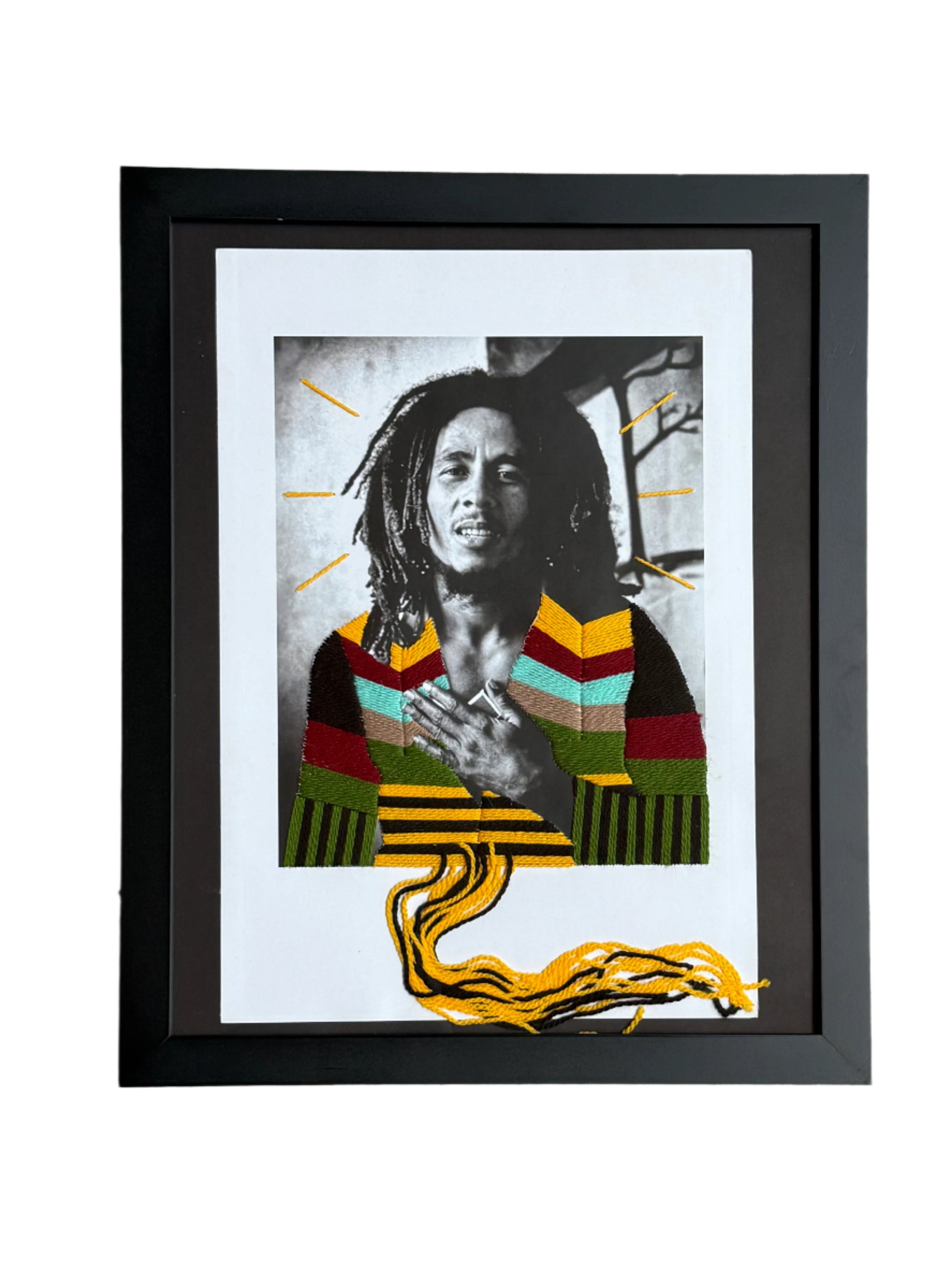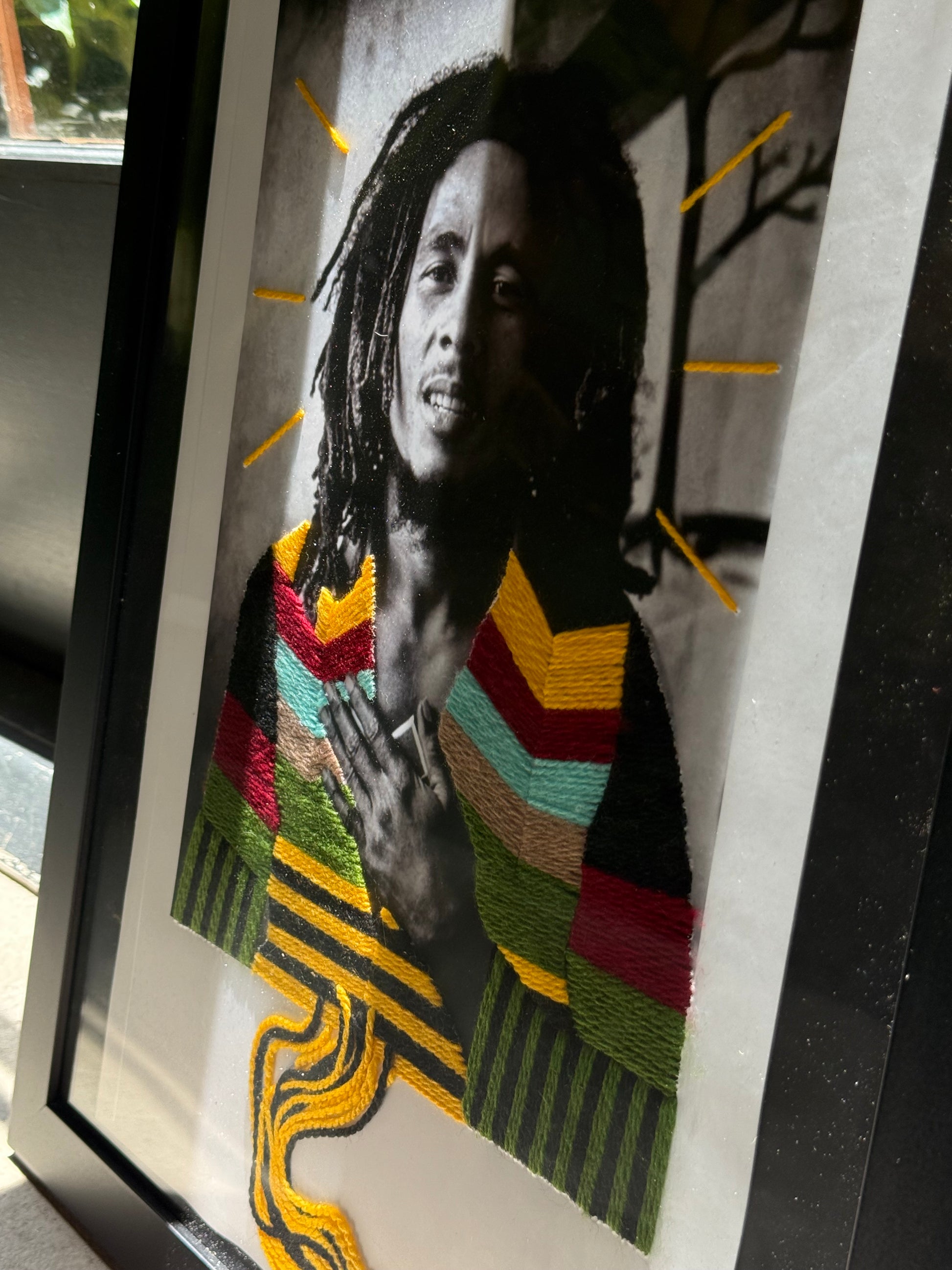 Bob Marley portrait 250 gsm lamina paper with handmade yarn embroidery intervention.