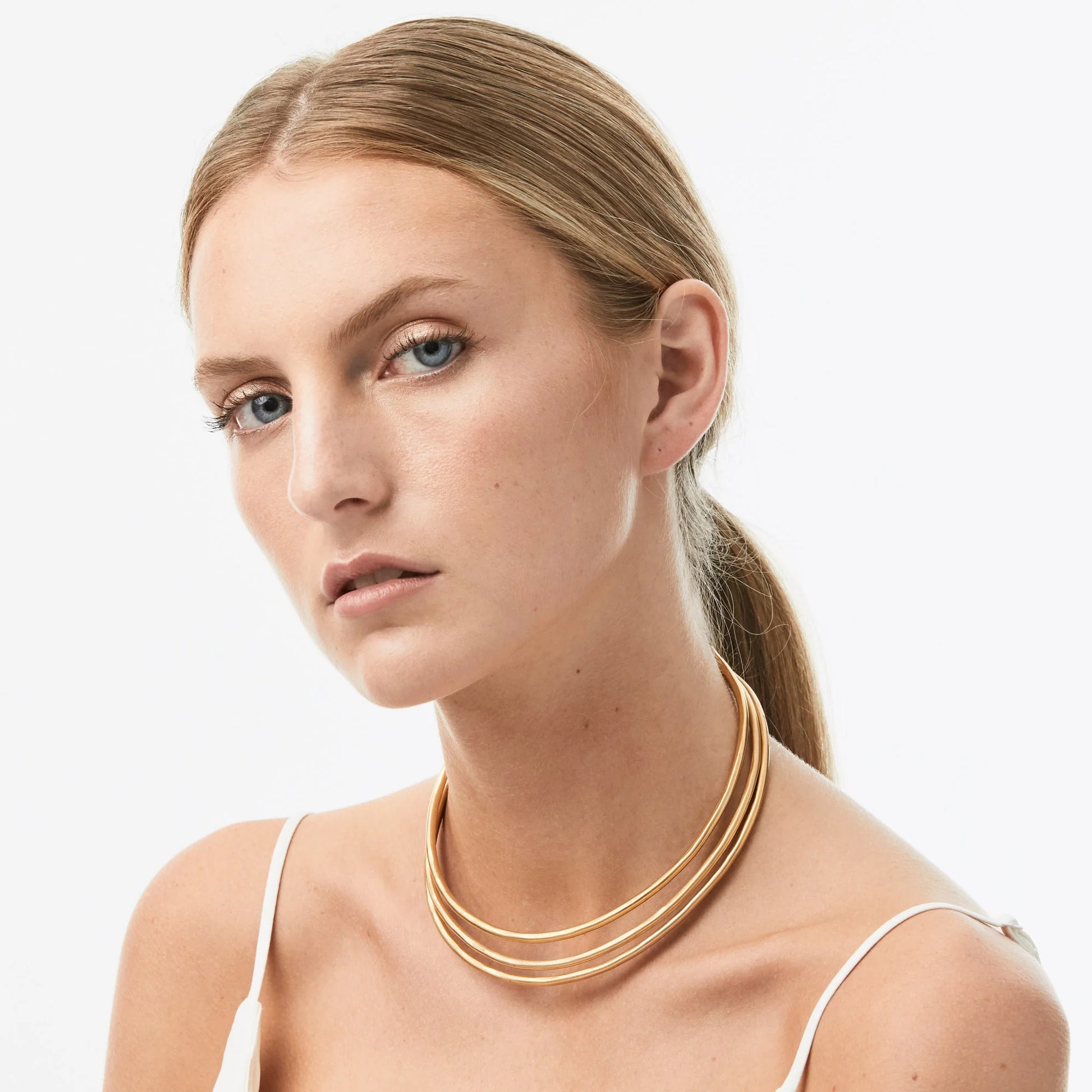 A timeless staple and customer favorite, the Goddess Collar is back. Hand-formed from heavy gauge wire and lightly hammered to catch the light, this versatile piece can be worn with the opening in the front or back. Slightly adjustable and perfect for stacking or wearing solo.