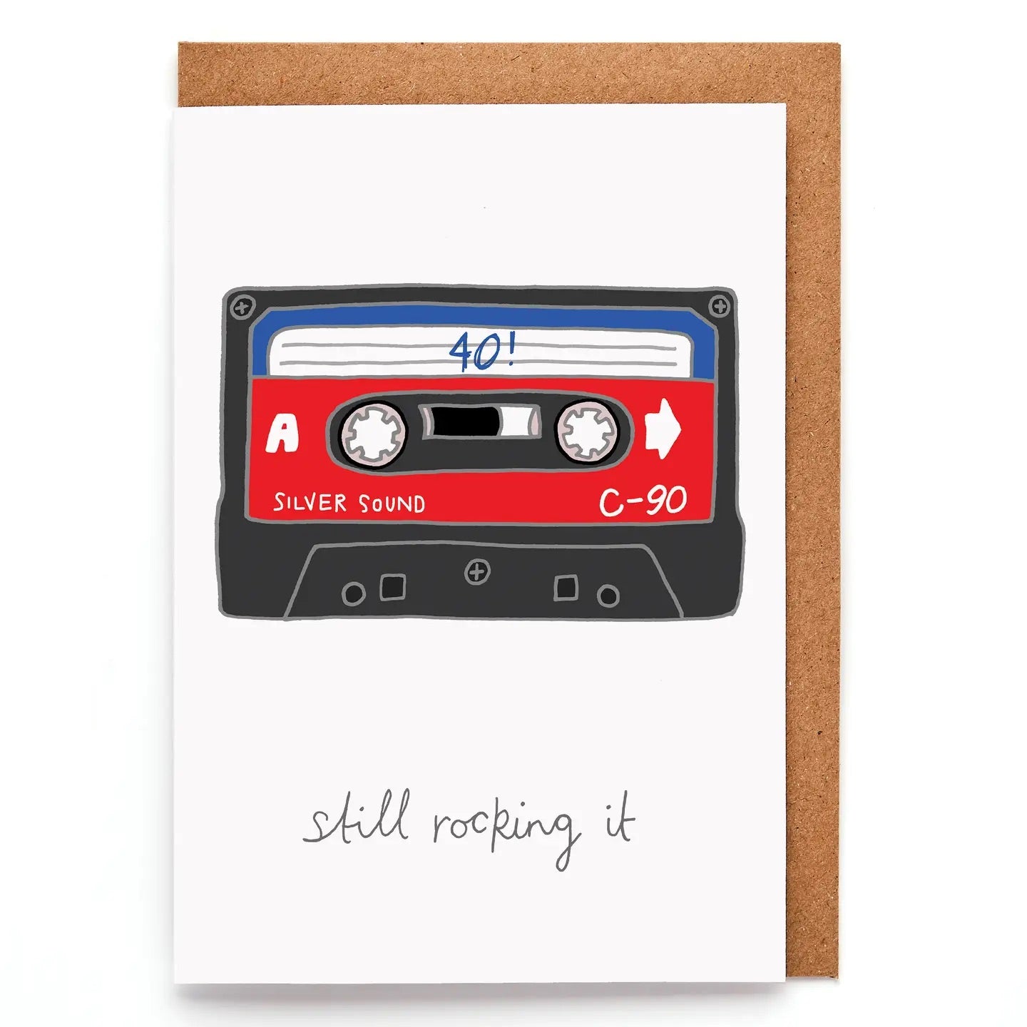 40TH - Crank up the nostalgia with this witty birthday card for a milestone celebration. Perfect for marking the big 4-0, this retro-inspired design features a hand-drawn illustration of a classic cassette tape, complete with a hand-scribbled "40" on the label. Size: 105mm x 150mm. Supplied with Kraft envelope.