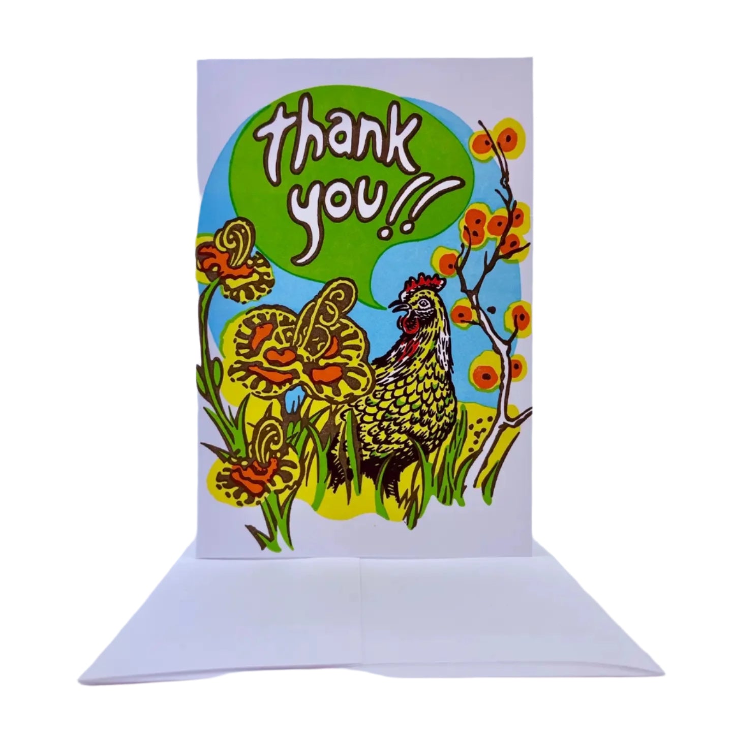 A message of gratitude from your local backyard chicken. Vibrant and happy. Filled with flowers, sunshine and summer vibes. Letterpressed in multiple overlapping colors. Blank inside for your own message. 6 1/4"x 4 1/4" card with matching standard A6 square flap envelope.