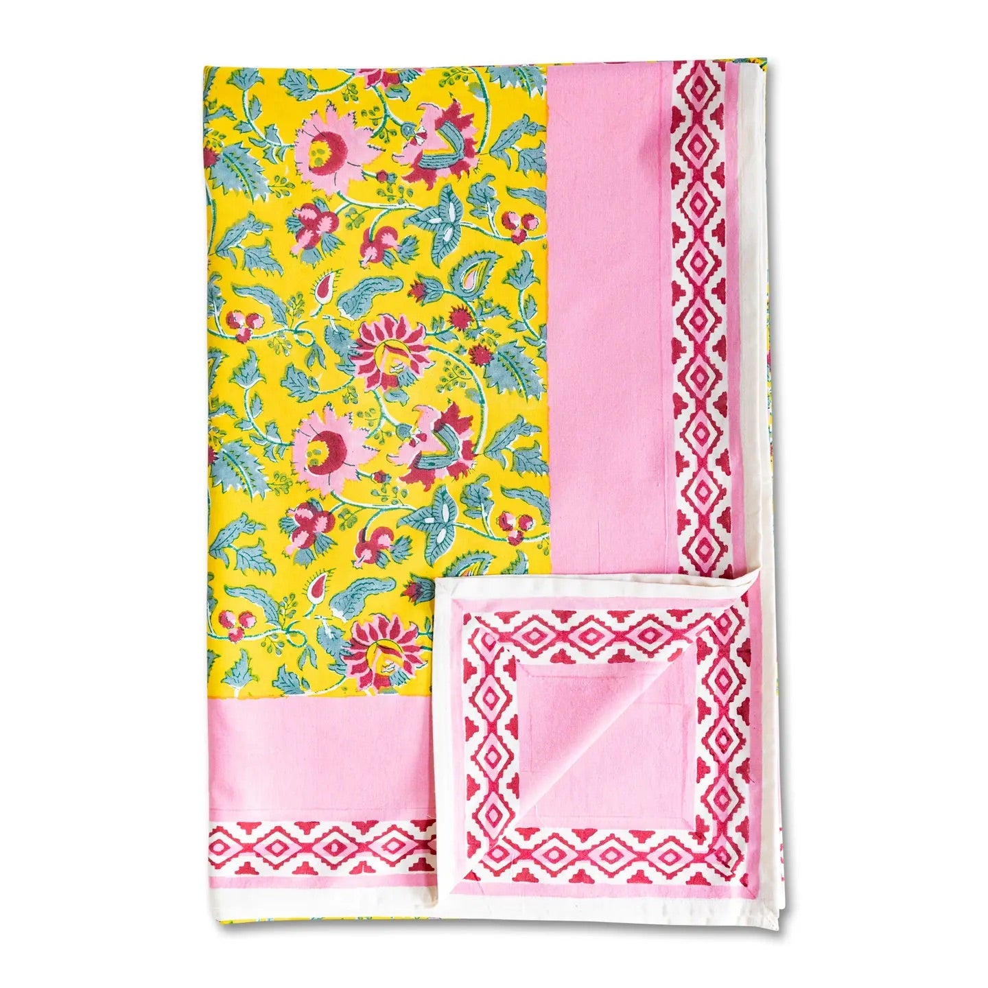 Make your meals extra festive with our exclusive blockprint rectangle tablecloth. Handmade in India, the charming color combo and the striped scalloped trim make a bold statement. By opting for sustainable table linens over disposable, we can help cut down on waste and support an age-old craft by artisans in Jaipur.