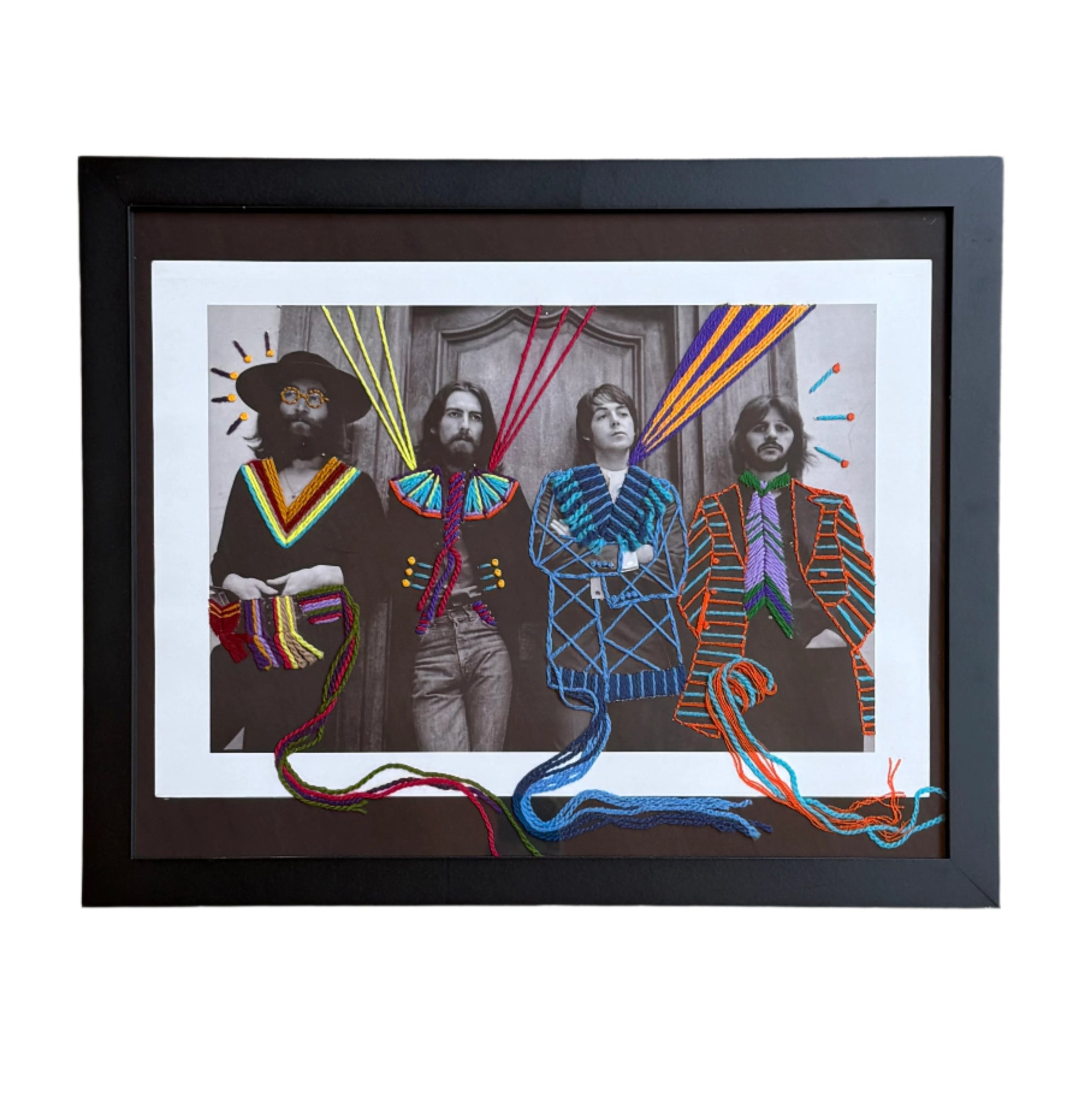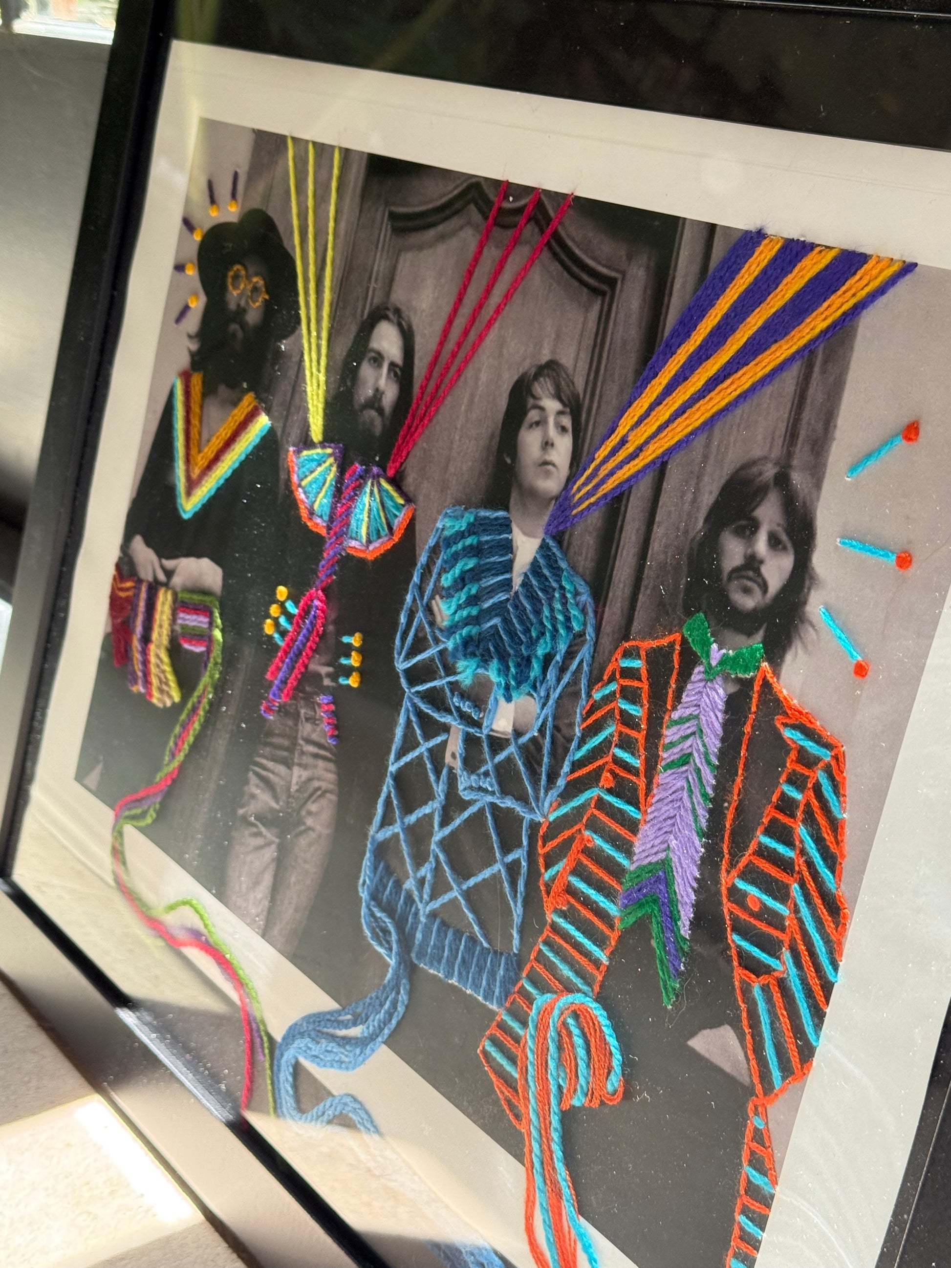 The Beatles portrait 250 gsm lamina paper with handmade yarn embroidery intervention.