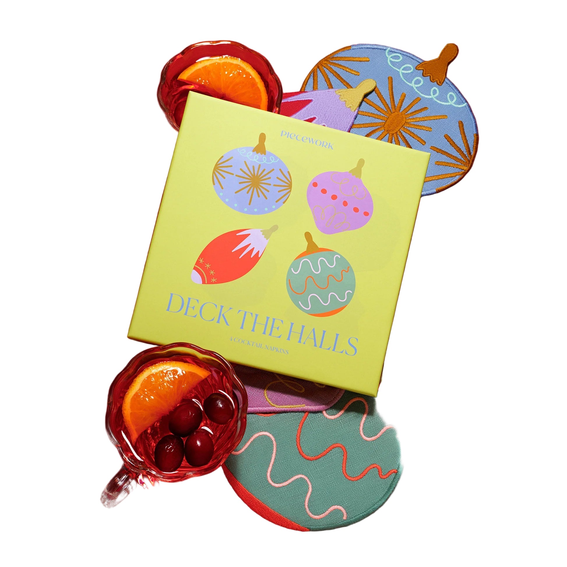 Four 100% linen cocktail napkins featuring various shapes and forms