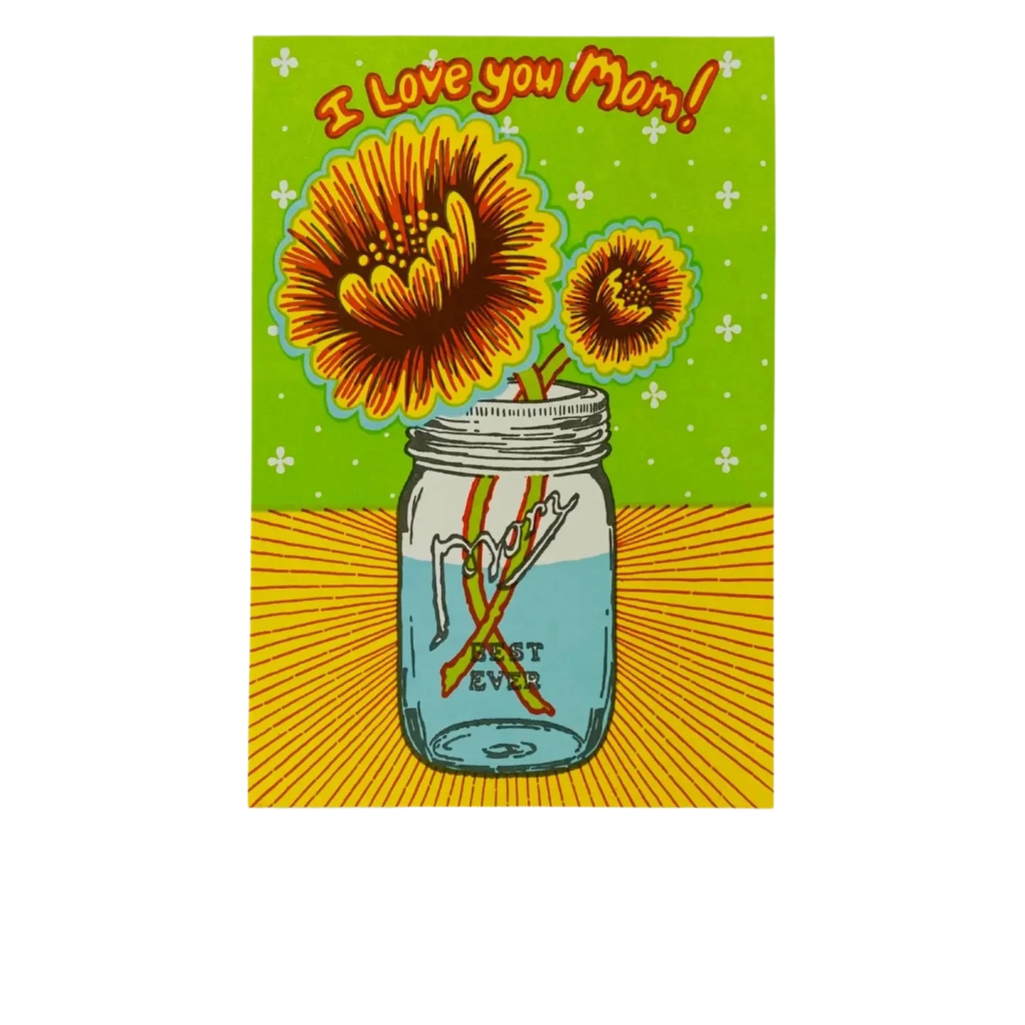 Fresh flowers for Mothers Day. Mason jar reads "Mom best ever". Classic and beautiful spring colors and the best words any mom wants to hear. I love you. Letterpressed in multiple overlapping colors. Blank inside for your own message. 6 1/4"x4 1/4" card with matching standard A6 square flap envelope. Card comes in a #5 recyclable open flap clear sleeve.