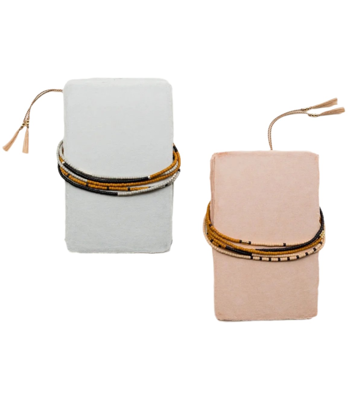 Abacus Row's Kego wraps showcase both pattern and palette. Each Kego is uniquely and thoughtfully designed with a one-of-a-kind pattern. Their beloved wraps can be worn as a necklace or wrapped as a bracelet.