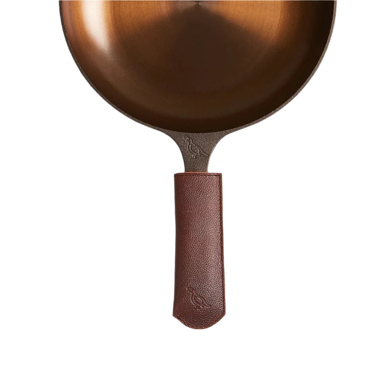 Handcrafted and branded with the Smithey logo over high-grade oil-tanned leather, this skillet sleeve is one of their favorite tools. Available in two sizes, the standard-fit slides perfectly over the handle of our Traditional Cast Iron Skillets while the extended fit is designed to give more protection to the handles on our Chef Skillets and the No. 11 Deep Skillet. Like cast iron, these sleeves get better with time and use.