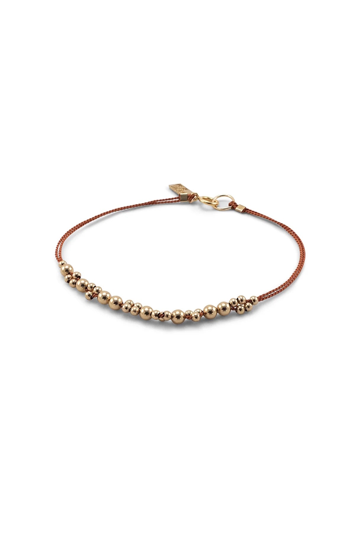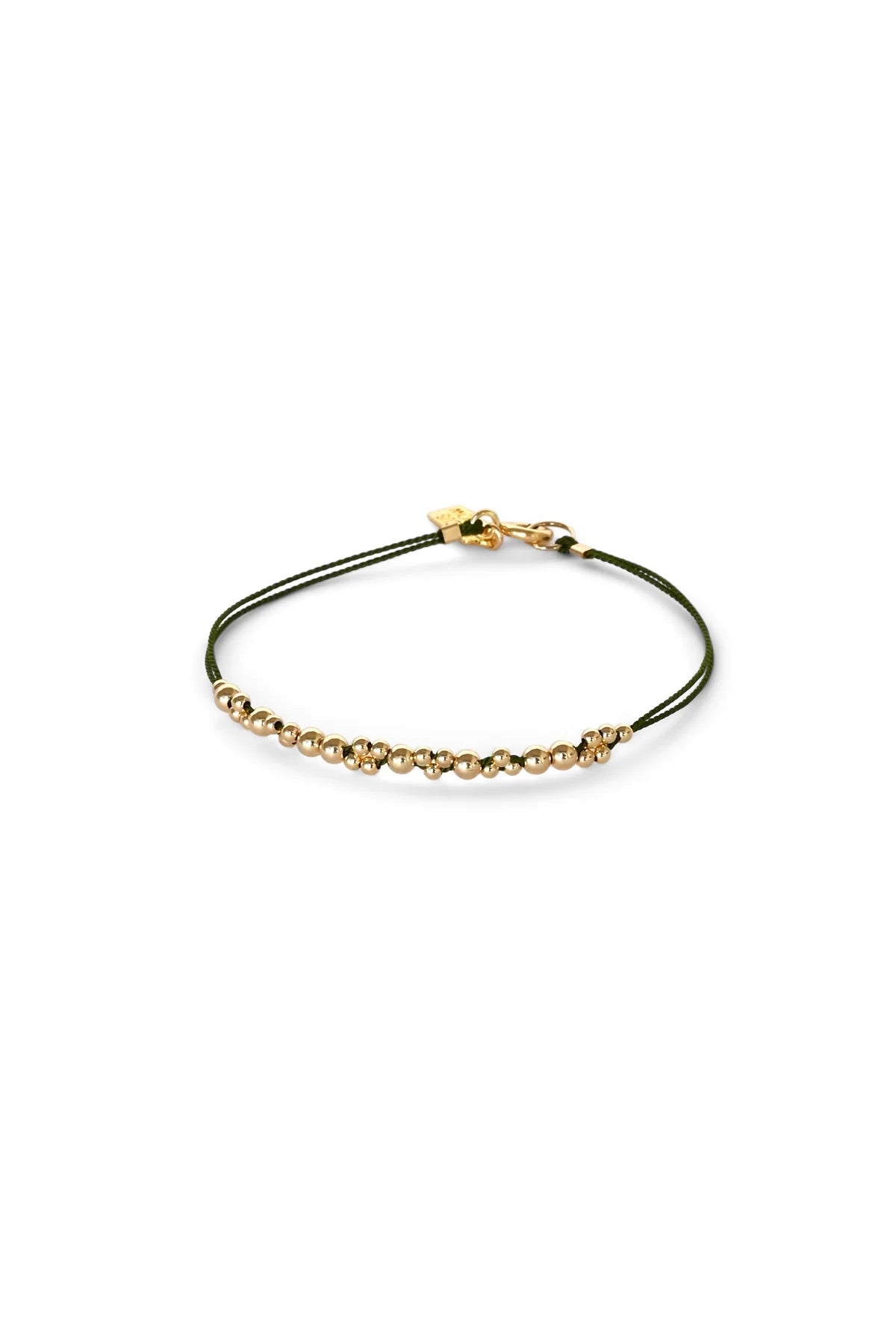 Abacus Row's Leo Major, a namesake of their signature pattern, is a two-stranded silk cord bracelet adorned with an extended segment of detailed gold beadwork.