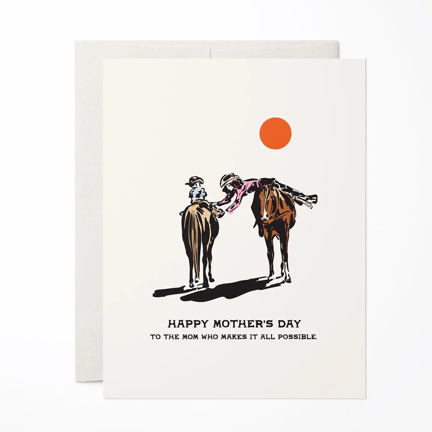 Show appreciation for a special mom with this heartfelt Mother’s Day card. Featuring an illustration of a mother and child on horseback, with the mother lovingly leaning over to help her child, this card captures the spirit of support and care that moms provide. The phrase, "Happy Mother’s Day to the mom who makes it all possible," adds an extra touch of gratitude. Blank inside, it’s ready for your own personal message.