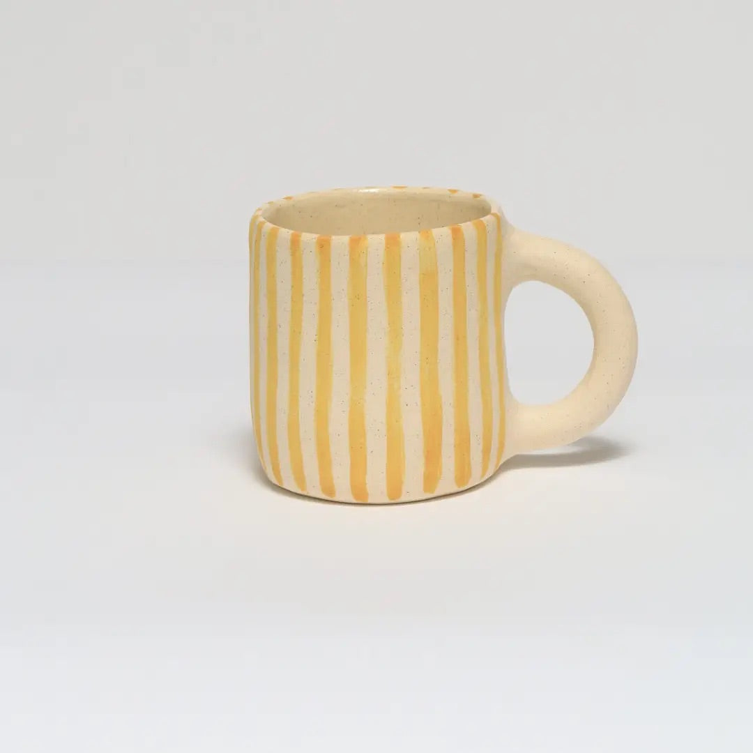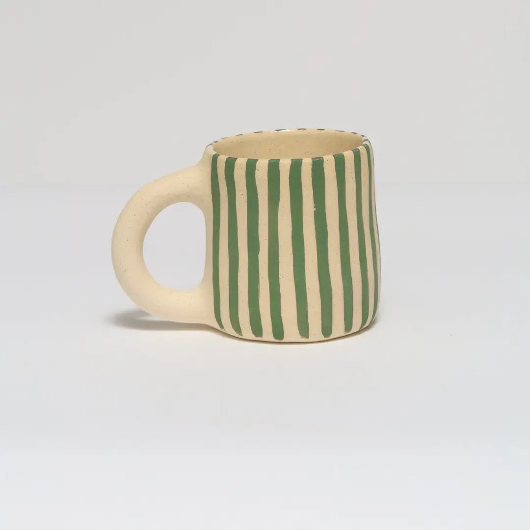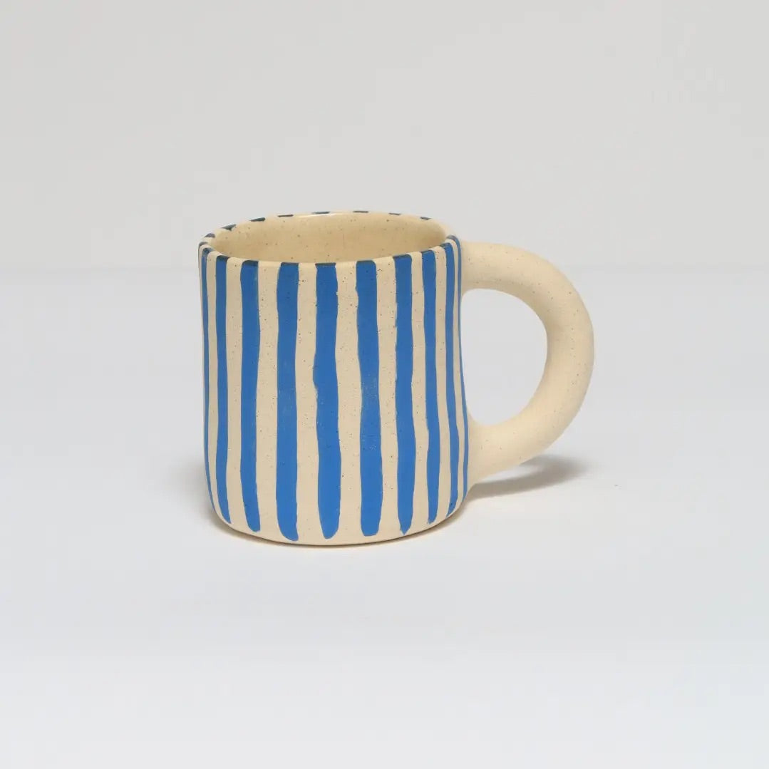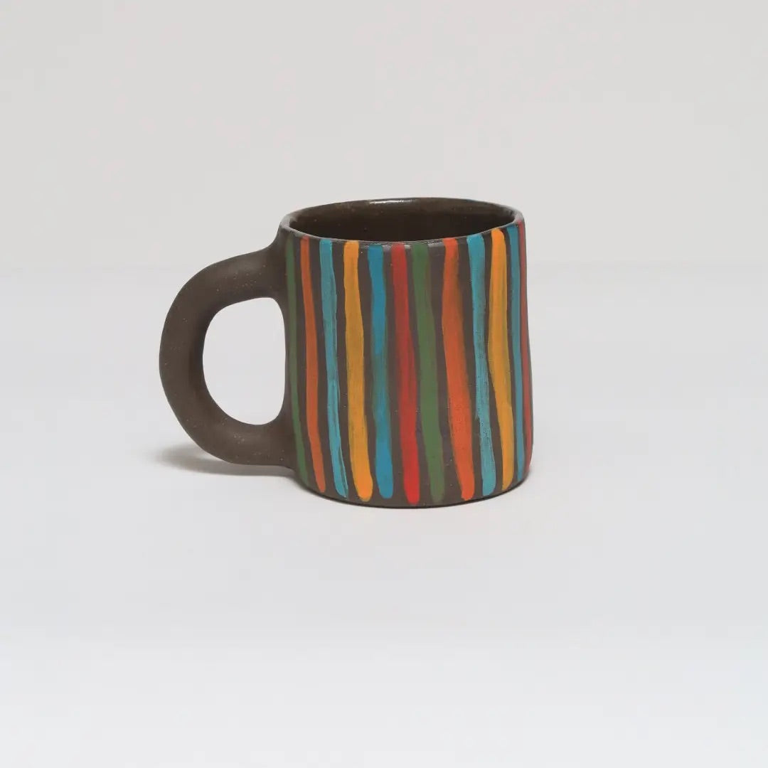Handmade ceramic mug featuring a hand painted stripe design in colorful underglaze. The interior + lip of the mug are coated in a clear glaze.