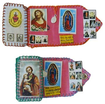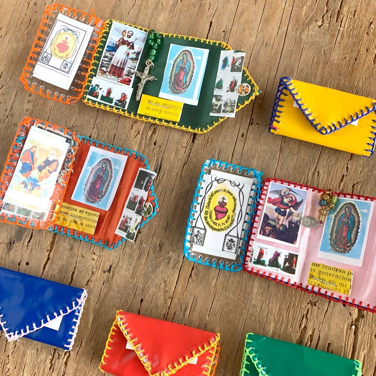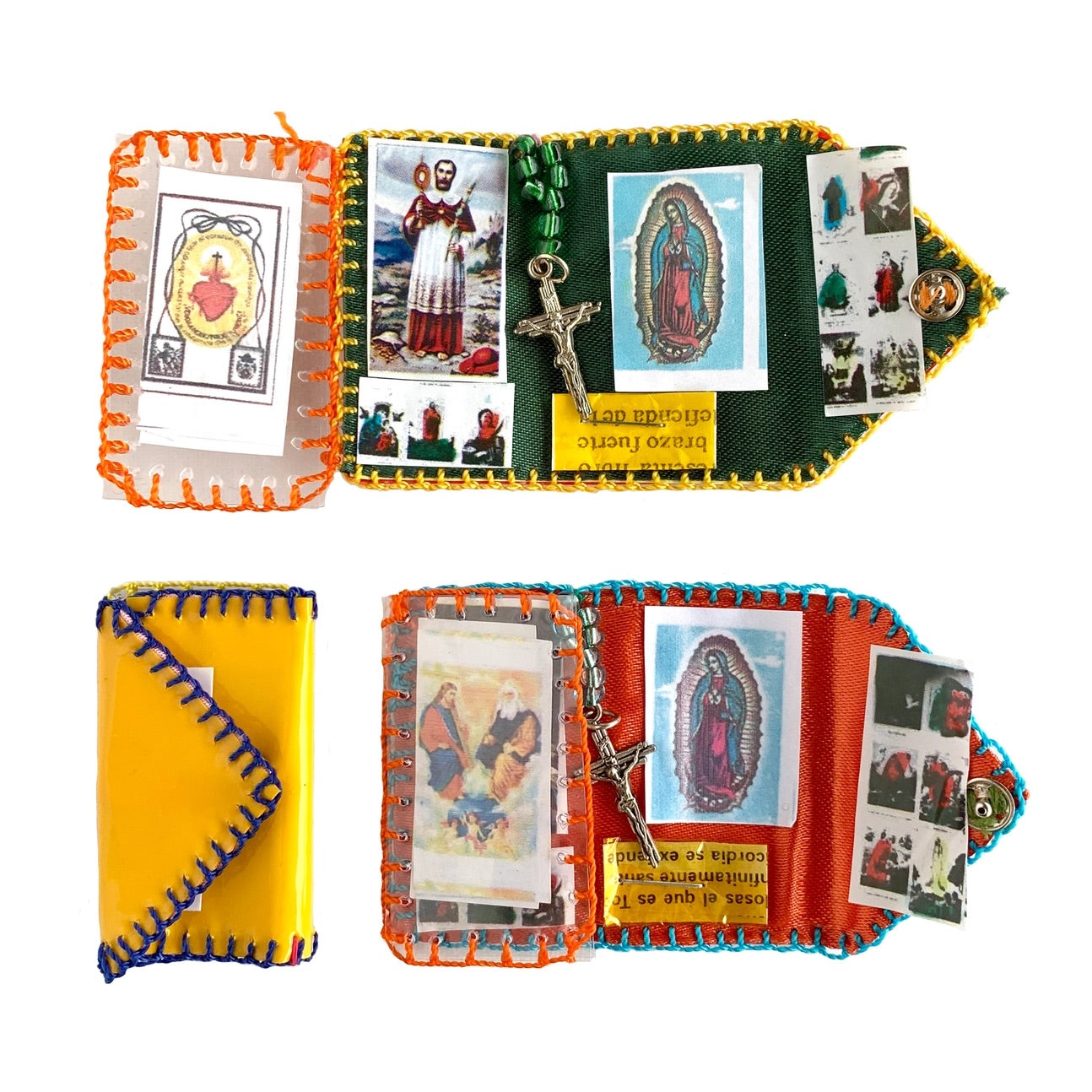 Hand made in Mexico for the Shrine of the Guadalupe. Traditional Small Plastic "Wallet" with mini rosary, saint pictures, and a section of the prayer "La Magnifica". Carried to bring blessings or protection to the carrier. Each wallet is unique and will vary in color and images. 4 x 2.5 inches when open.