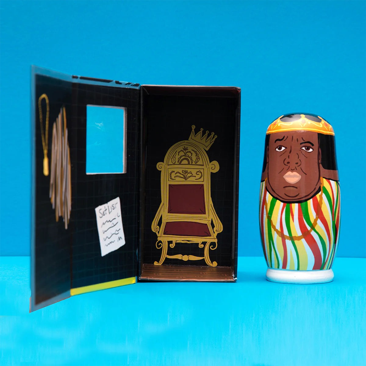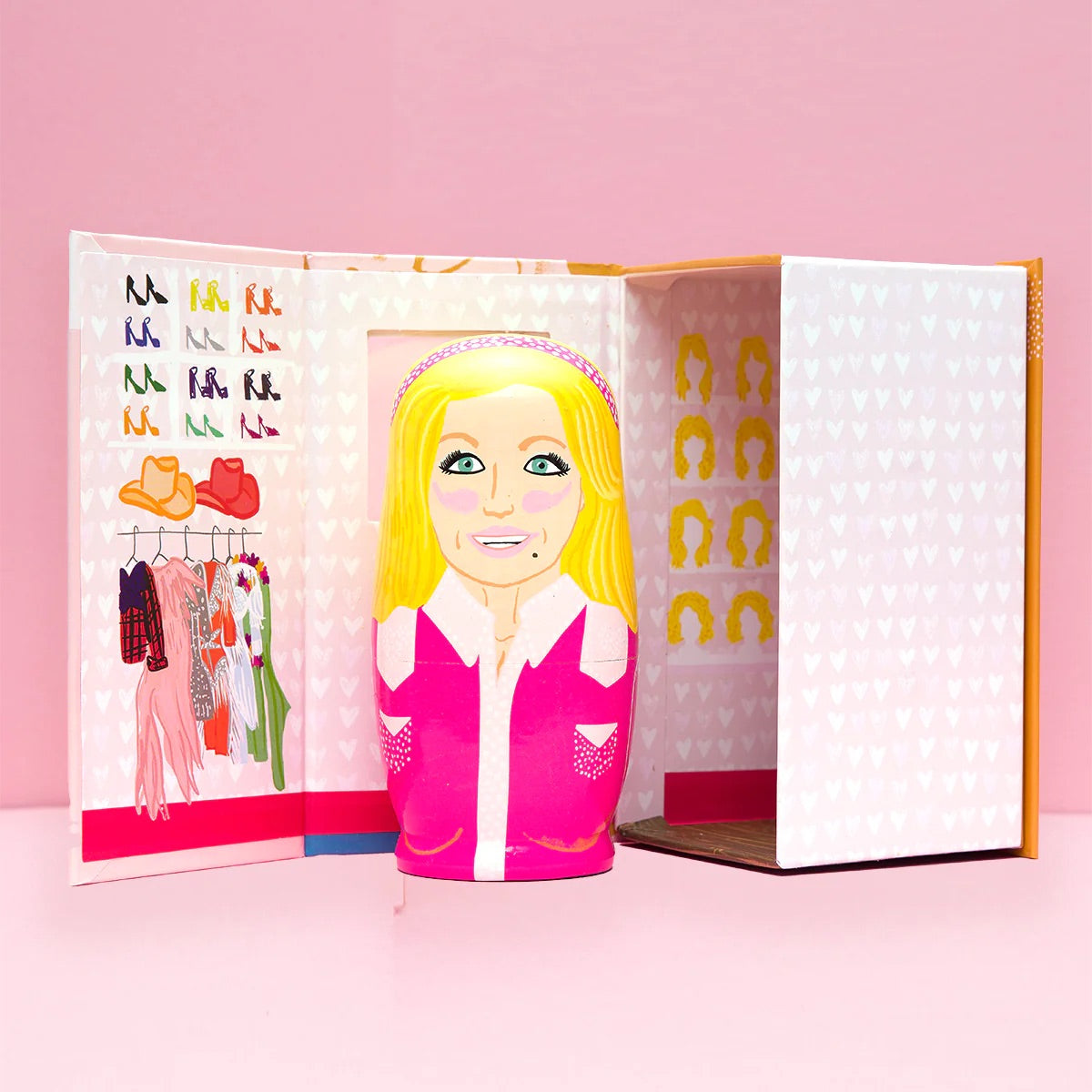 Set of 5 wooden nesting dolls (AKA Russian Matroyshka dolls) that fit into one another. Each box opens up to reveal a star-studded dressing room!
