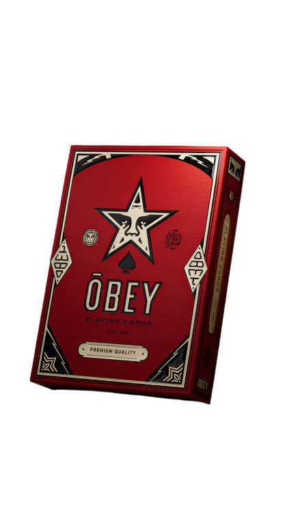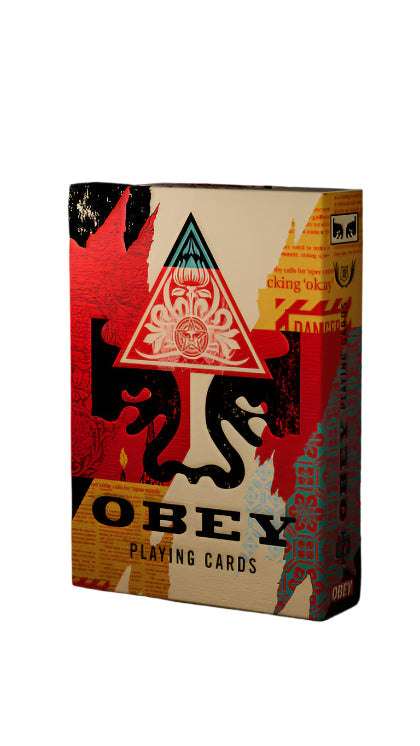 Two breathtaking decks, representing eras of OBEY. Each deck has a unique back design and packaging, printed with multiple layers of foil stamping and sculptured emboss. The two decks share common faces with vibrant, iconic OBEY art over the decades.