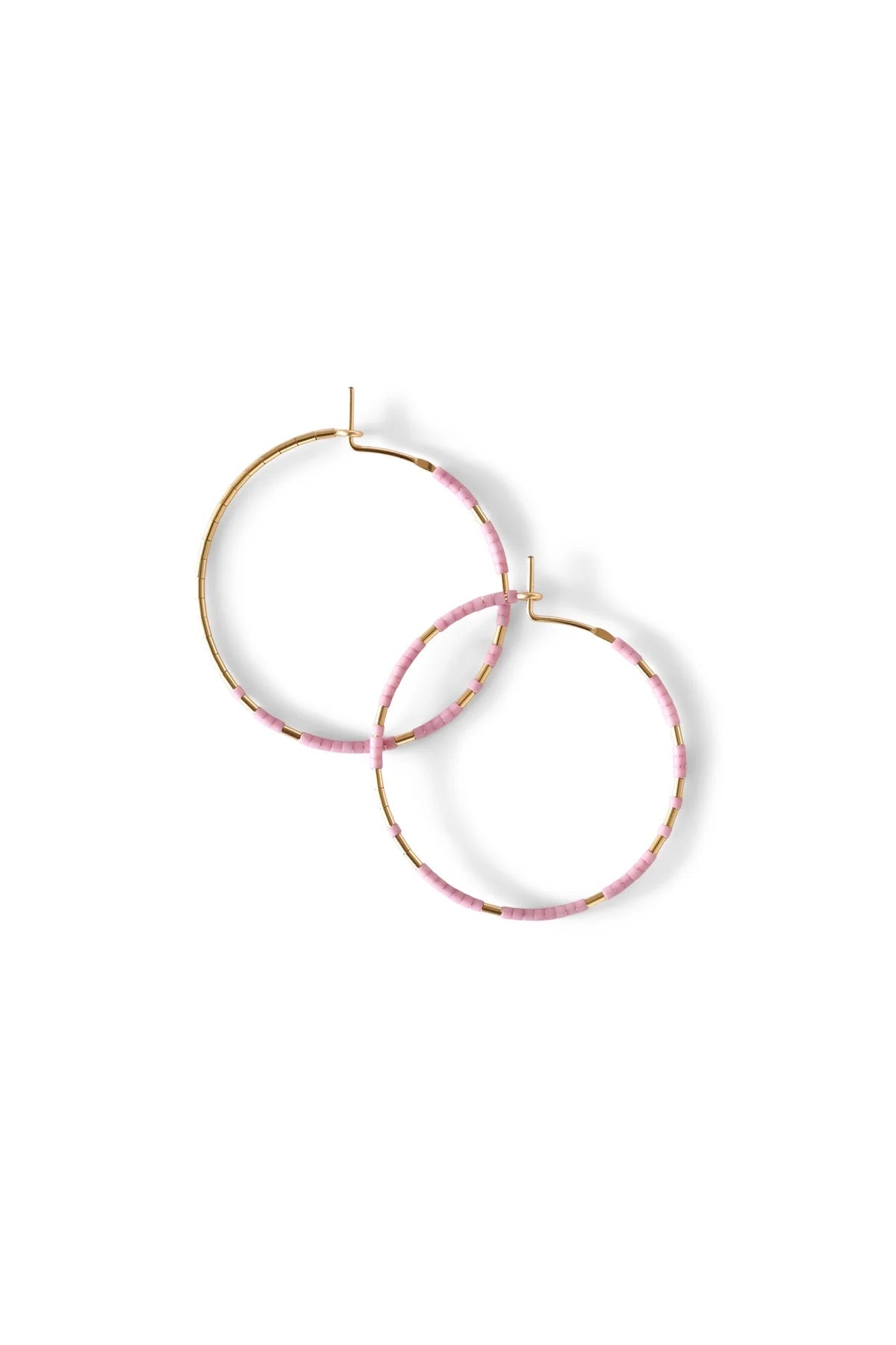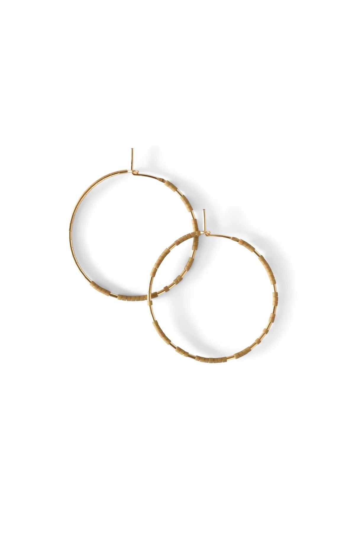 Abacus Row's Pan hoop earrings showcase an asymmetrical design of unexpected patterning of gold among matte glass beads. One earring in each pair features a gold-beaded segment along the backside of the hoop.