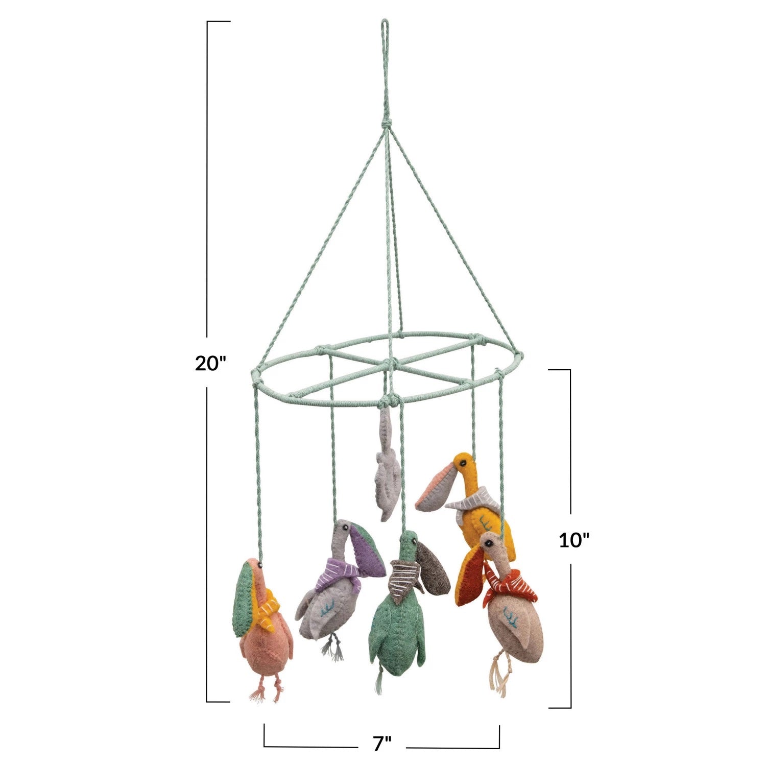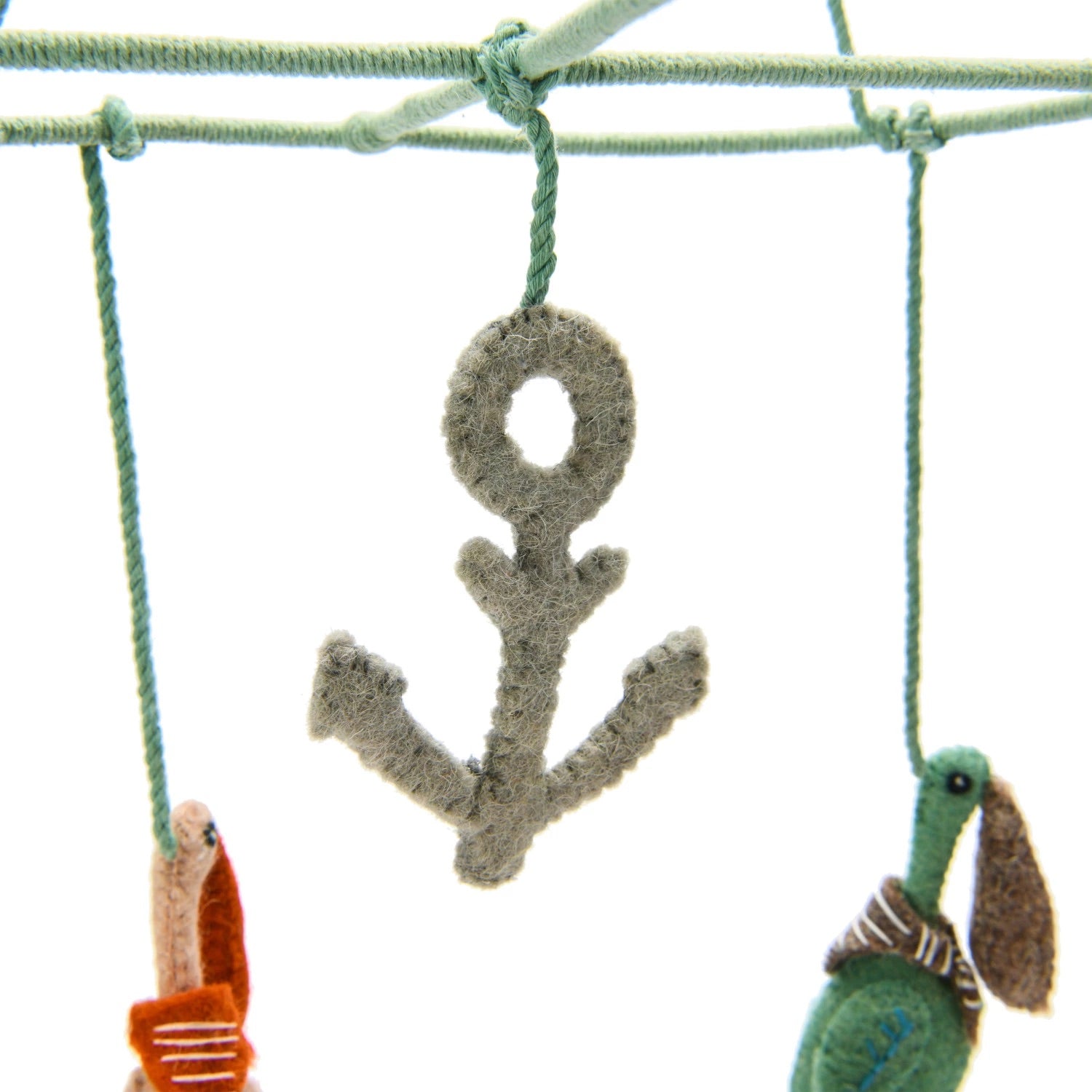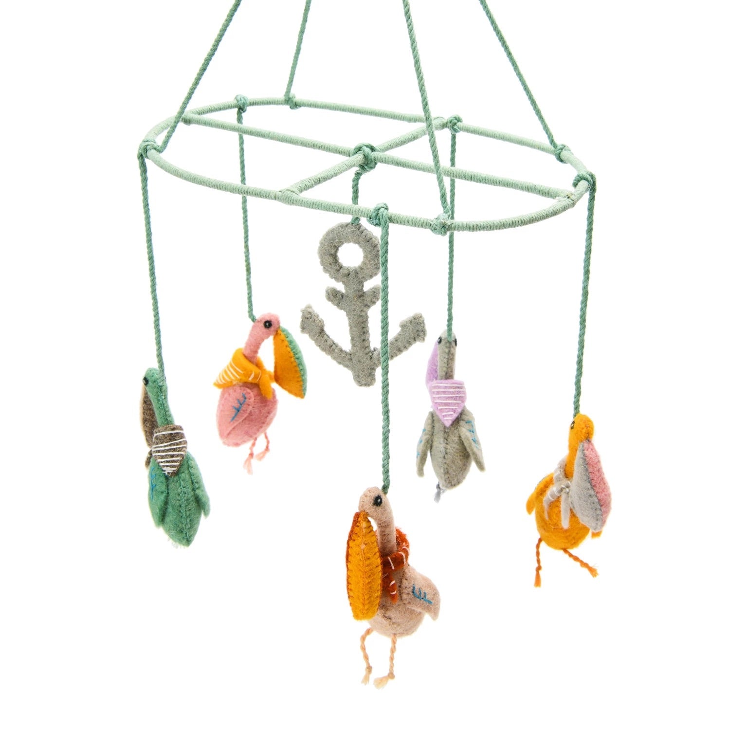 This wool felt mobile displays creative, and cute anchor and pelicans in a variety of colors. Mobile accessory colors are warm greys, and sage green with fun pops of lavender, peach, and mustard. An adorable accent piece for a baby's nursery that can transition to a fun ceiling decoration in a toddler's room. Hand-stitching details add an extra special design element to each mobile accessory piece.