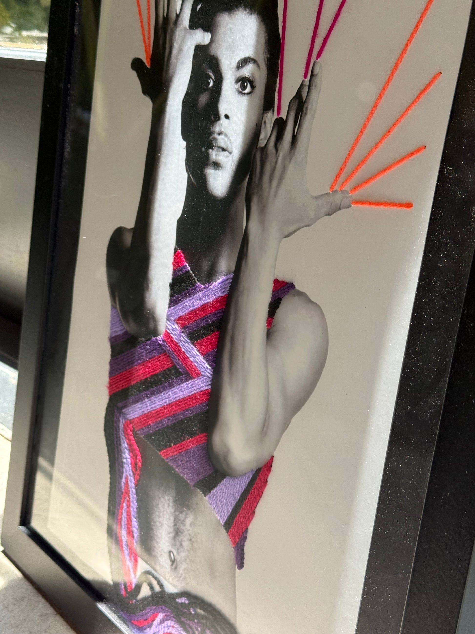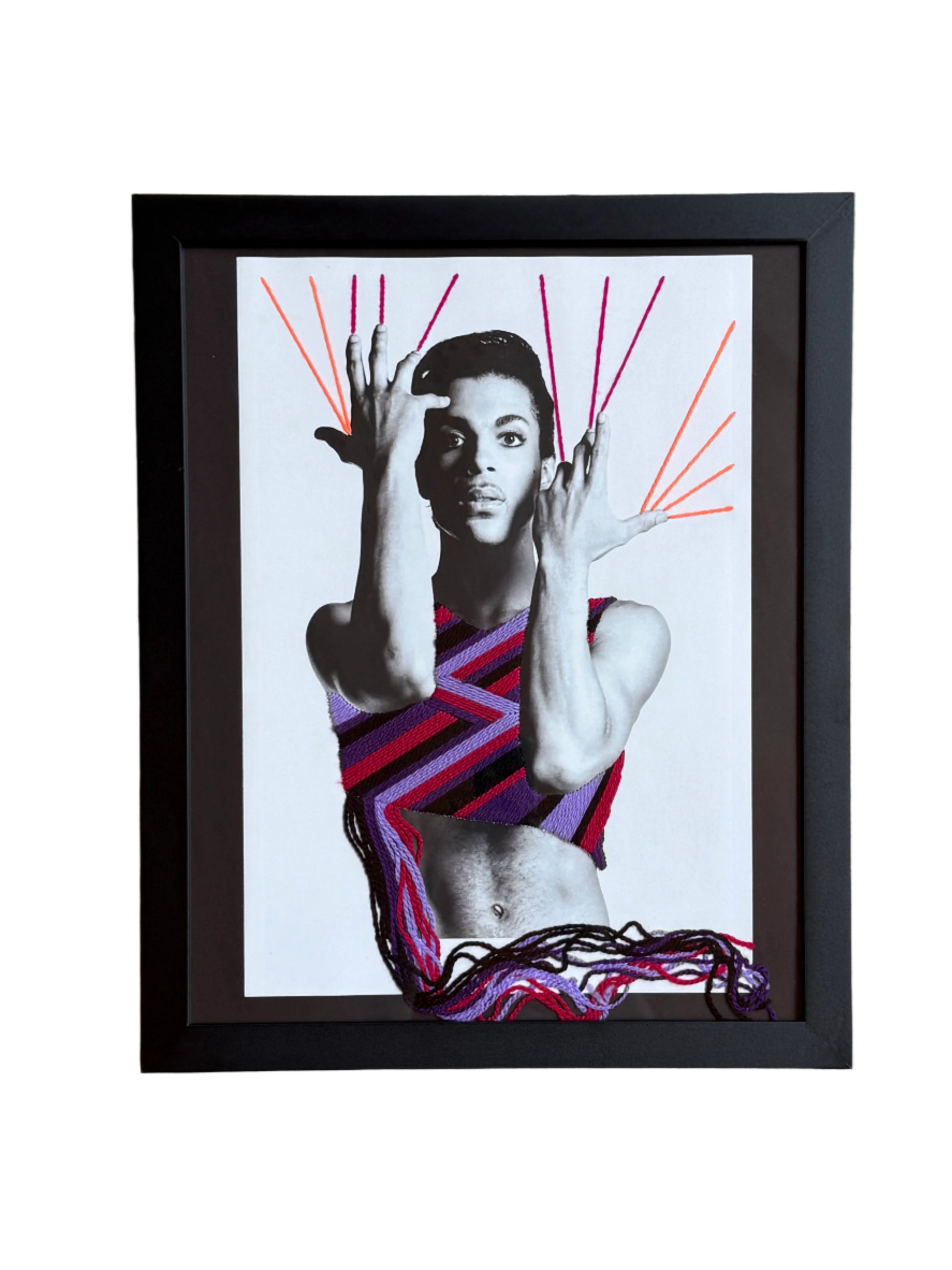 Prince portrait 250 gsm lamina paper with handmade yarn embroidery intervention.