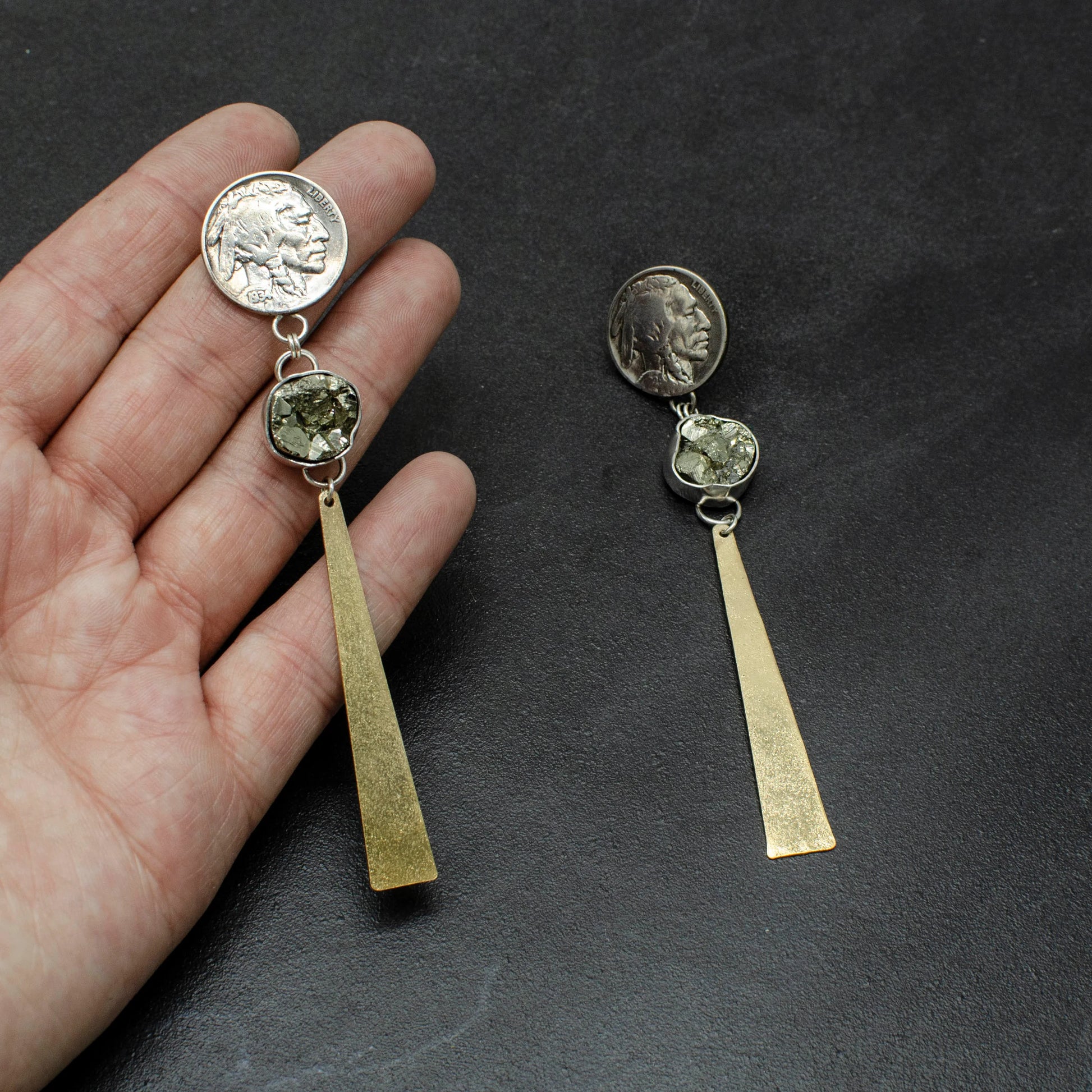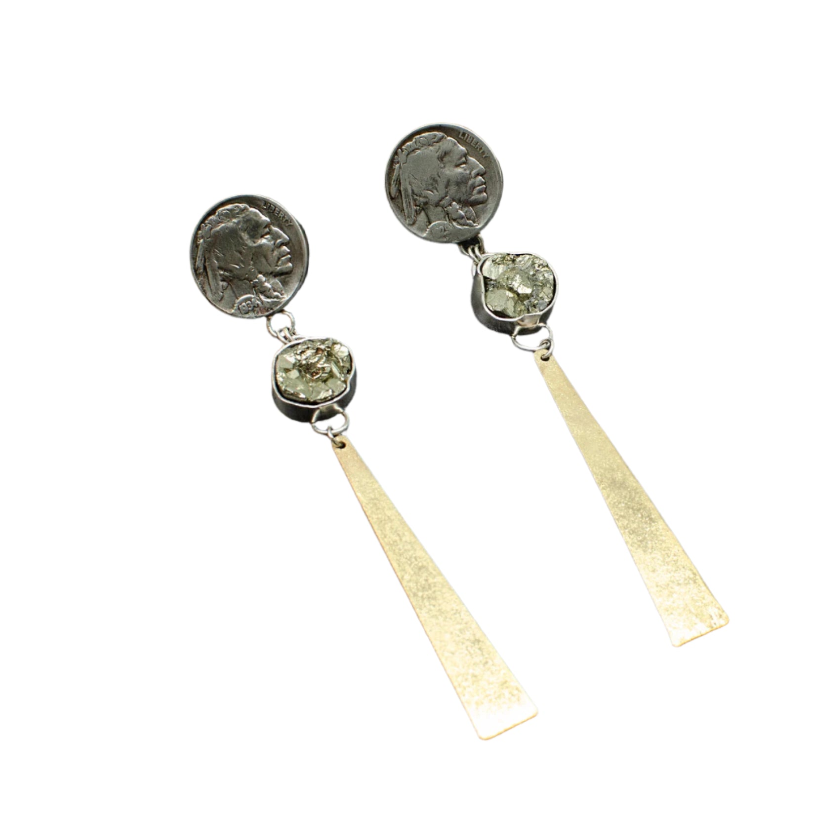 Embrace the allure of artisan craftsmanship with our Peruvian pyrite and authentic buffalo nickel drop earrings. Set delicately in sterling silver and adorned with 14k gold plated hammered metal drops, each pair is meticulously handmade in Nashville, Tennessee. Ready to ship and guaranteed to make a statement, these earrings seamlessly blend history and modern elegance.