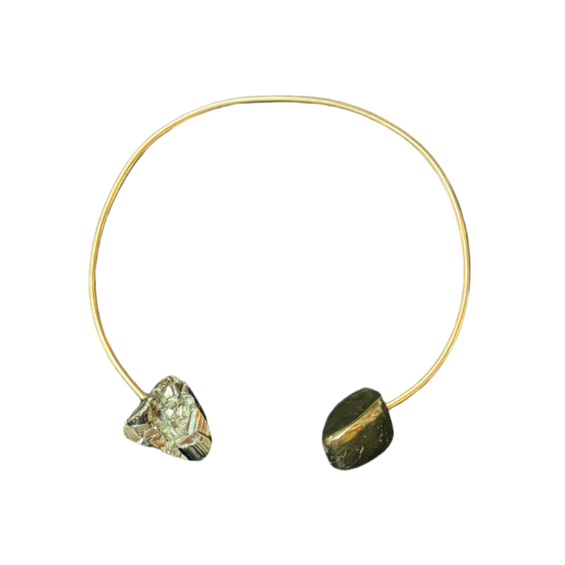 Crafted to make a bold statement, each collar is handmade with care, shaped and hammered around a neck mandrel to perfectly embrace the natural curves of the neck. Featuring 8-gauge brass wire, heavily plated in rich 14k gold, these collars exude a striking yet timeless appeal. At the heart of each piece, a Peruvian Pyrite stone sits elegantly, paired with a golden nugget, creating a beautiful contrast. The result is a powerful, one-of-a-kind piece that merges natural elements with contemporary design—bold and graceful all at once.