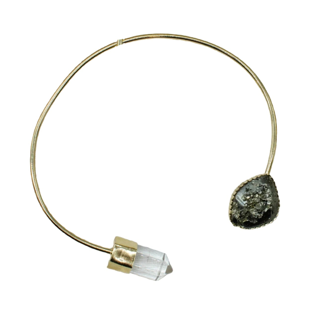 Crafted to make a bold statement, each collar is handmade with care, shaped and hammered around a neck mandrel to perfectly embrace the natural curves of the neck. Featuring 8-gauge brass wire, heavily plated in rich 14k gold, these collars exude a striking yet timeless appeal. At the heart of each piece, a Peruvian Pyrite stone sits elegantly, paired with a luminous quartz crystal point, creating a beautiful contrast. The result is a powerful, one-of-a-kind piece that merges natural elements with contemporary design—bold and graceful all at once.