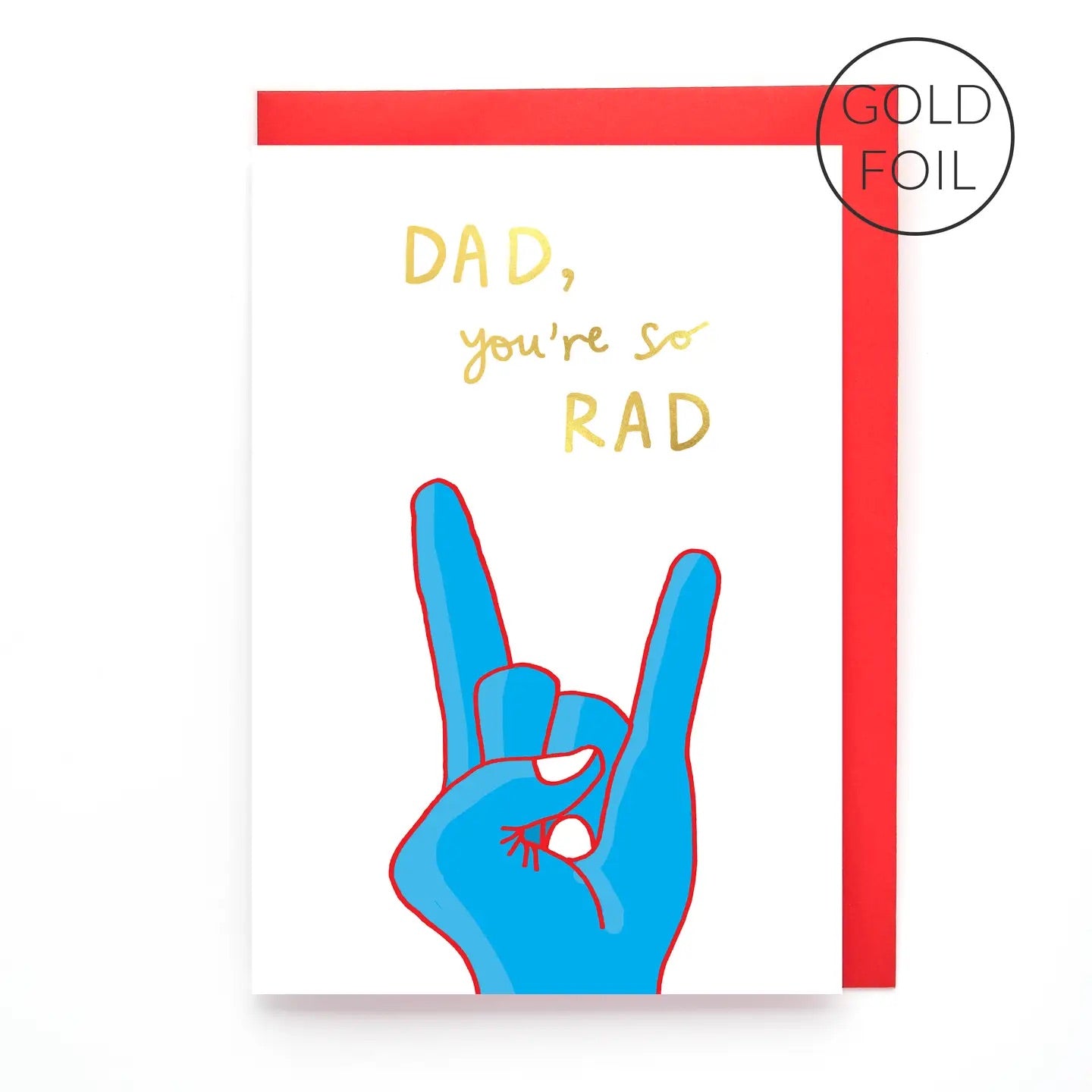 This dad card offers a heartfelt greeting that's just a little bit different from your usual greetings cards. Printed in the UK on FSC premium, recyclable paper, the hand drawn design features a hand in a 'rock on' pose. Painted in bright colours with a striking, hand lettered font and finished with gold foil, the message on the front of this funny dad card reads "Dad, you're so rad".