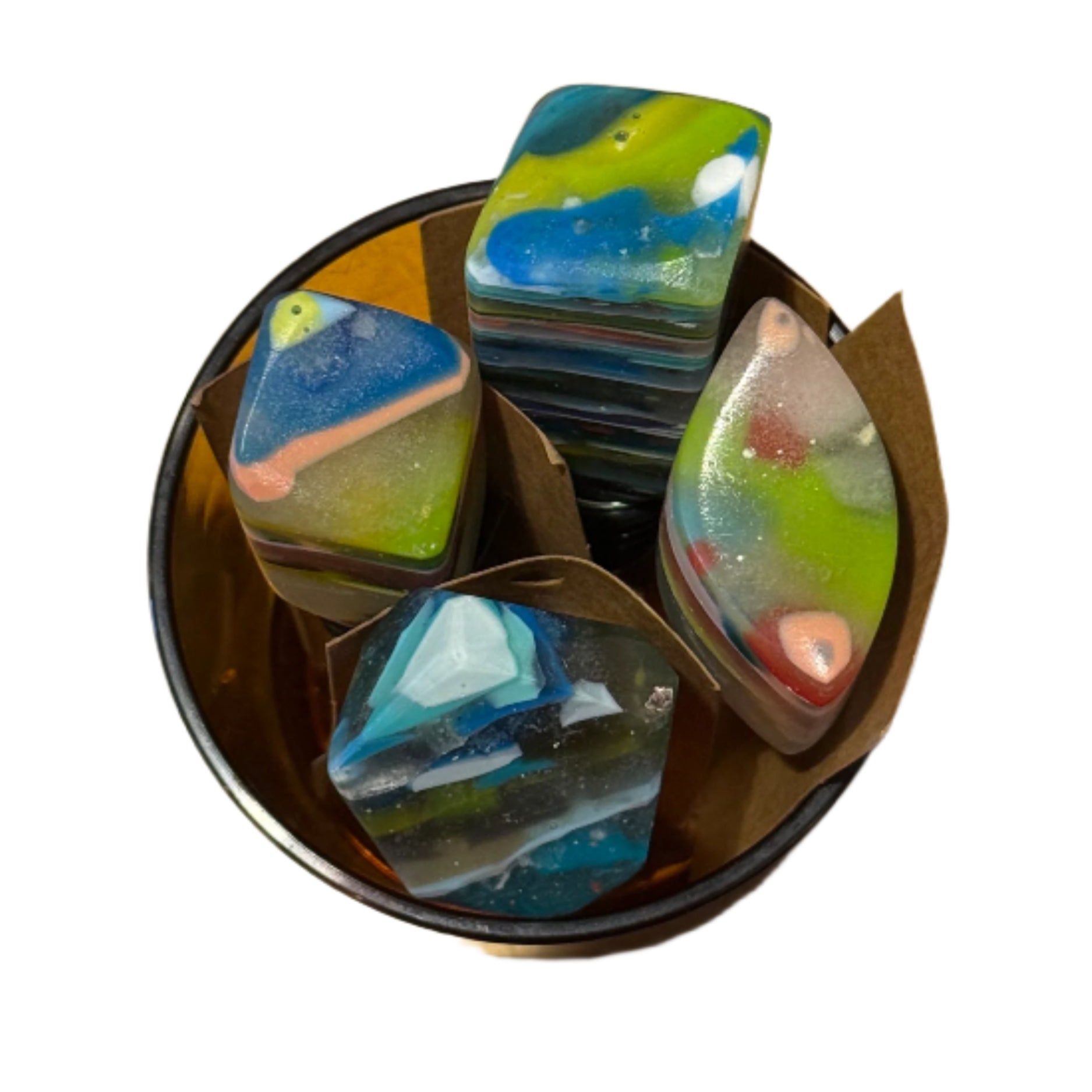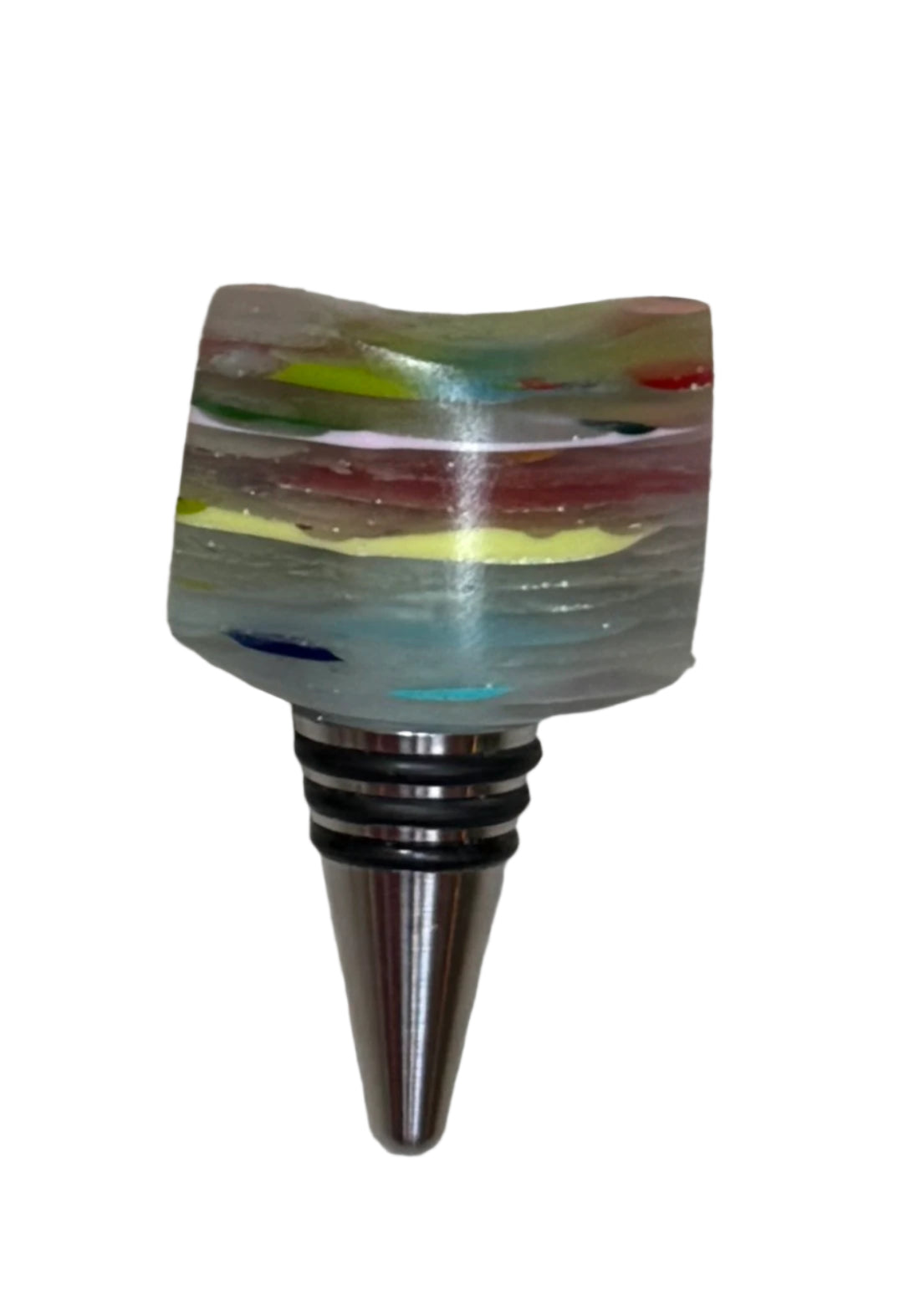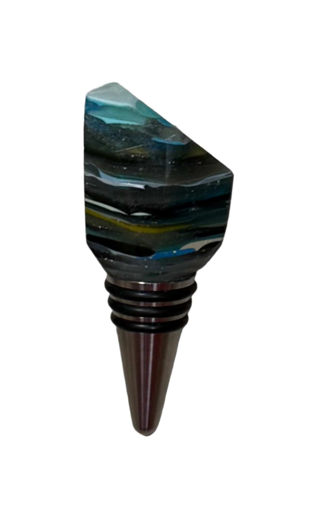 Hand made bottle stoppers made from upcycled surfboard resin from the surfboard laminating process. They are mounted with epoxy resin onto a bottle stopper. Each one is unique.