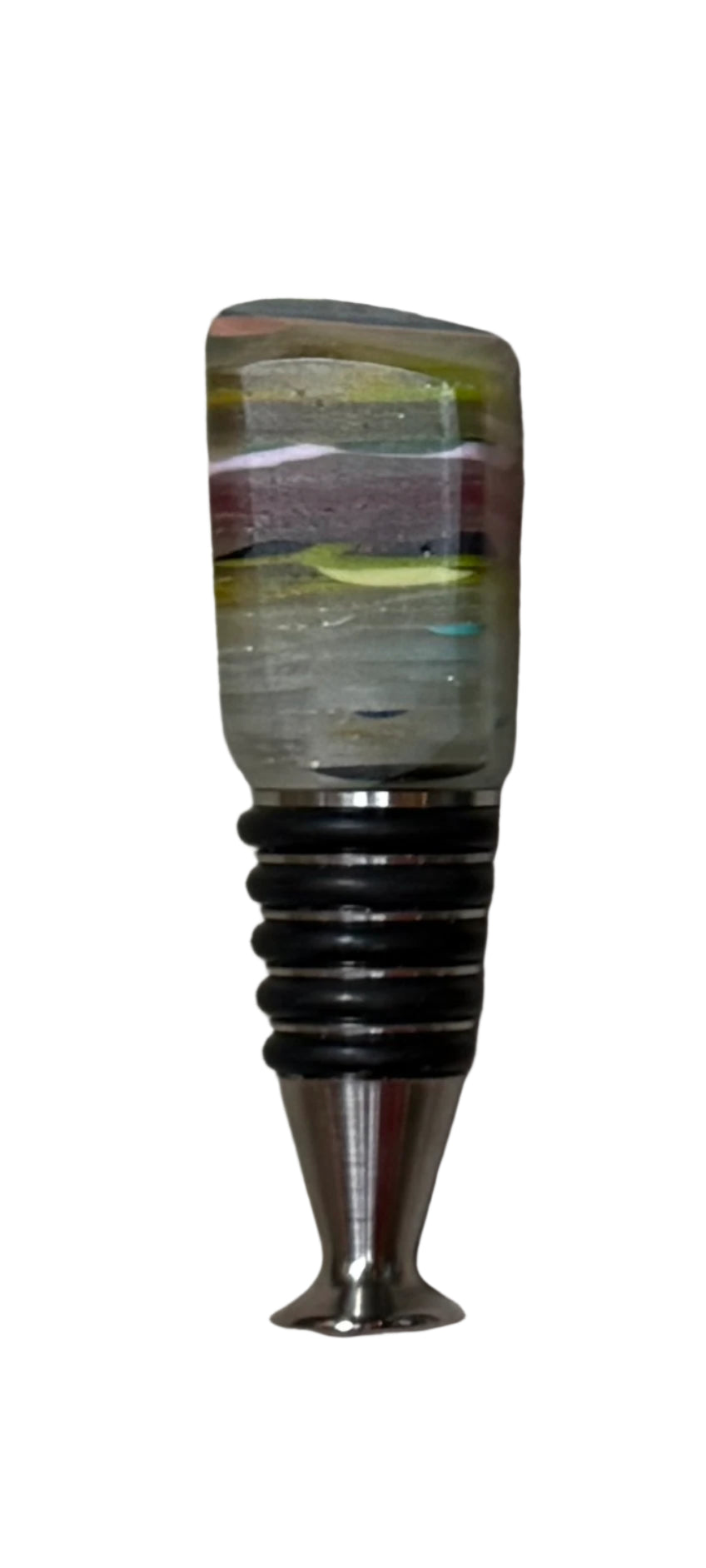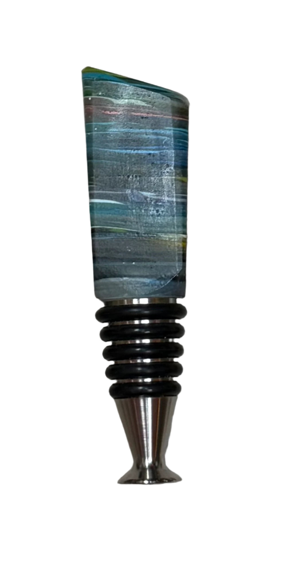 Hand made bottle stoppers made from upcycled surfboard resin from the surfboard laminating process. They are mounted with epoxy resin onto a wine stopper. Each one is unique.