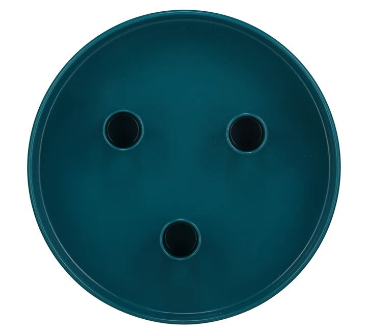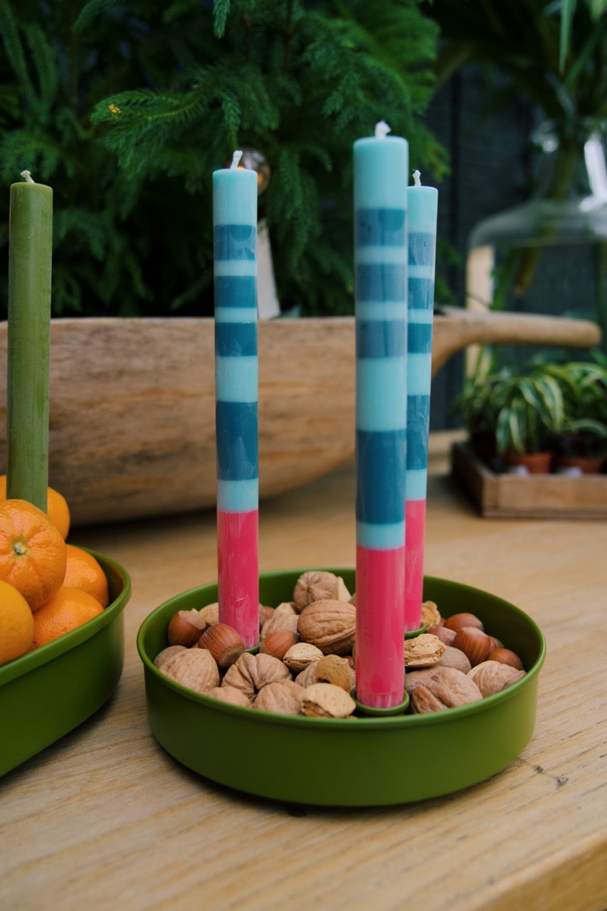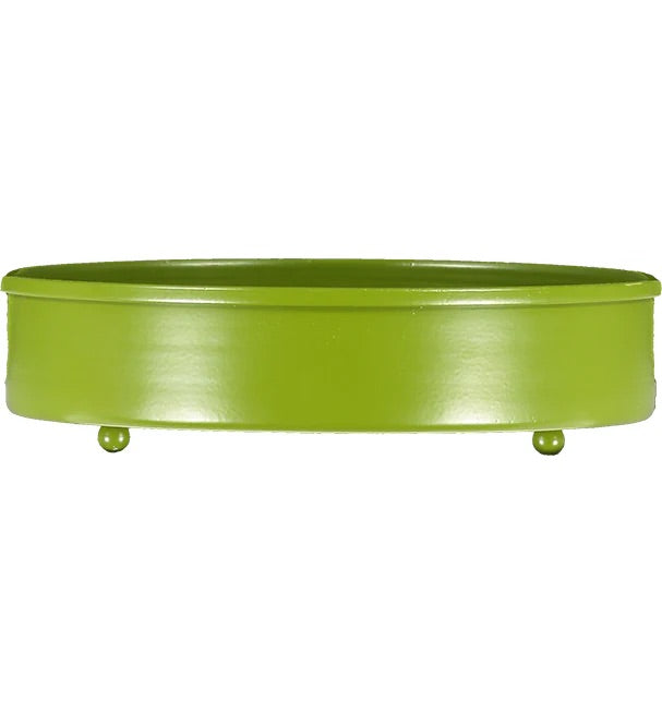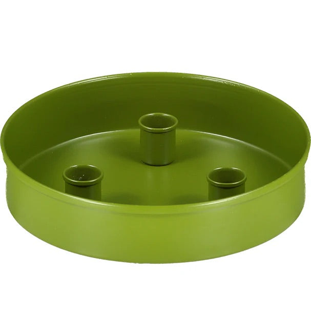 A British Colour Standard small round powder-coated steel candle platter in a lovely natural shade of Olive Green or a bold, vibrant blue.