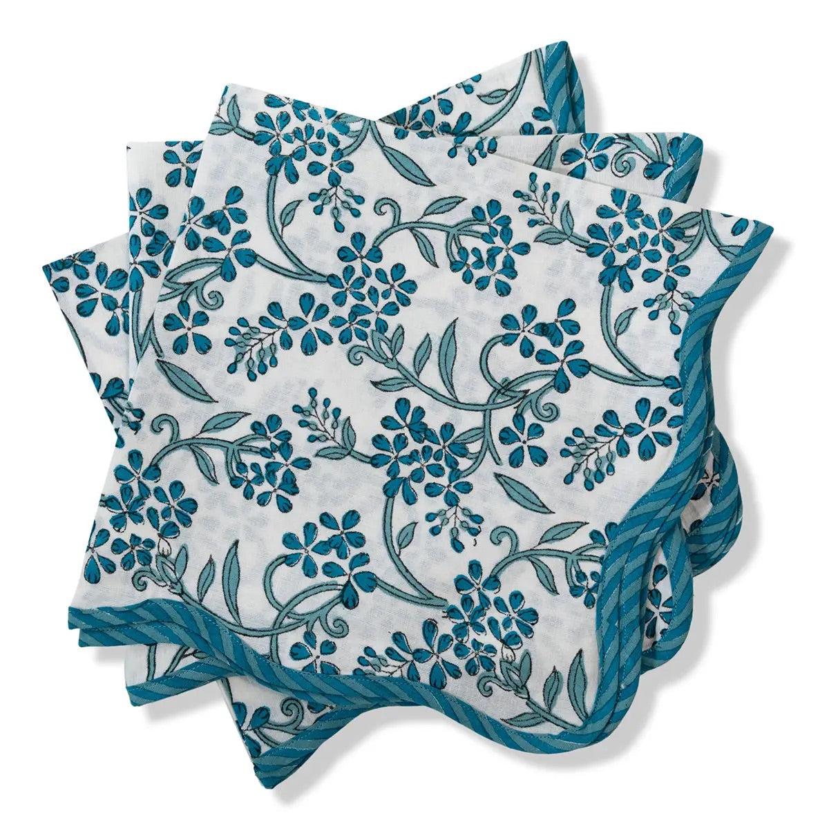 Make your meals extra festive with our exclusive blockprint scalloped napkins. Handmade in India , the charming color combo and the striped scalloped trim make a bold statement. By opting for sustainable table linens over disposable, we can help cut down on waste and support an age-old craft by artisans in Jaipur.