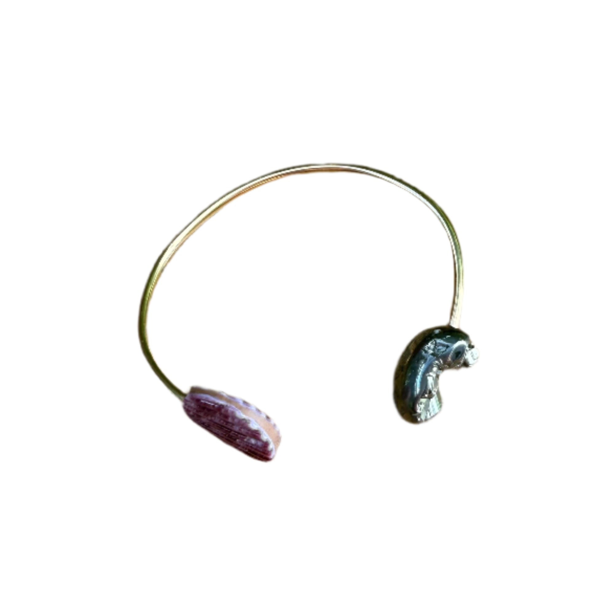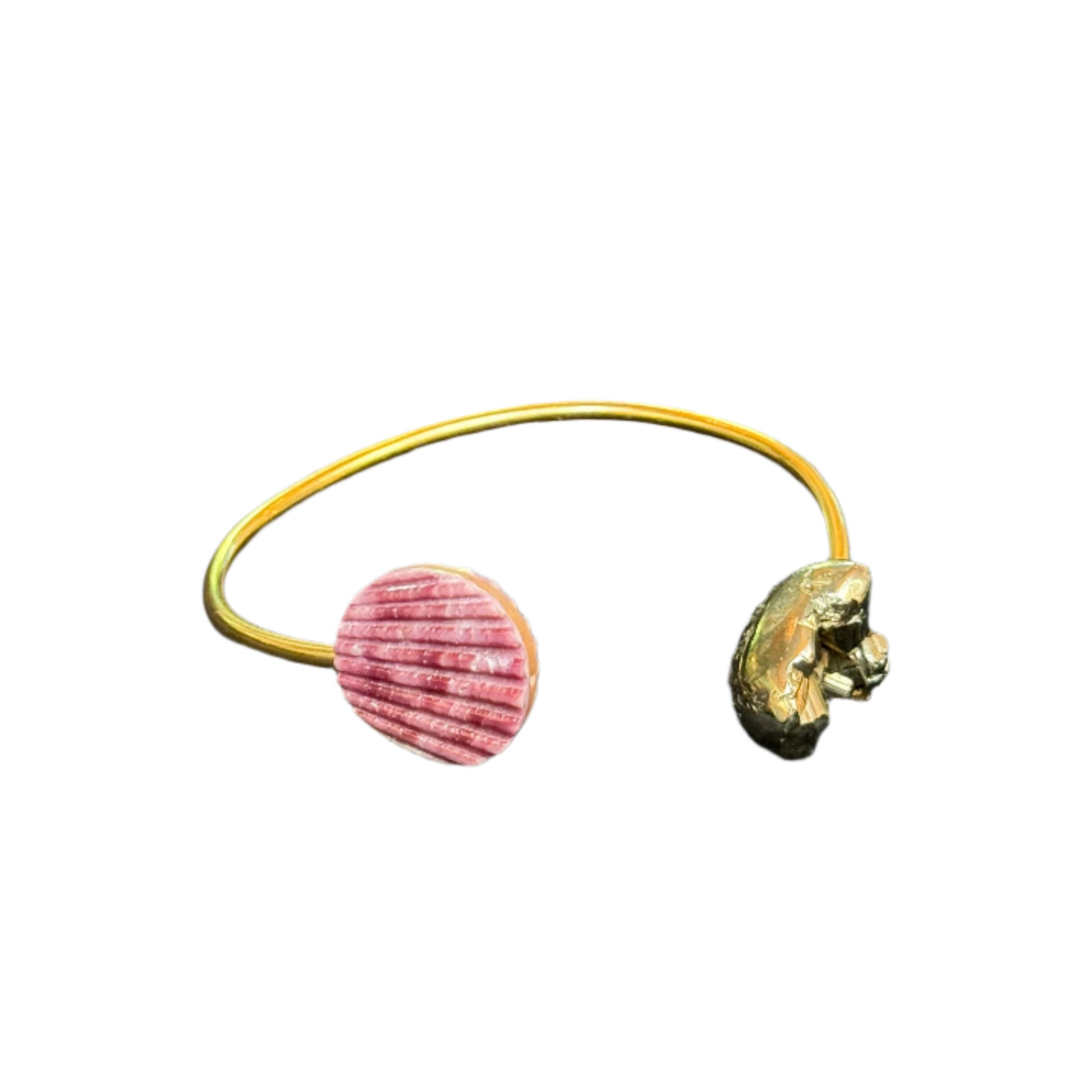 Asymmetrical cuff with hand drilled sea shell and Peruvian pyrite.