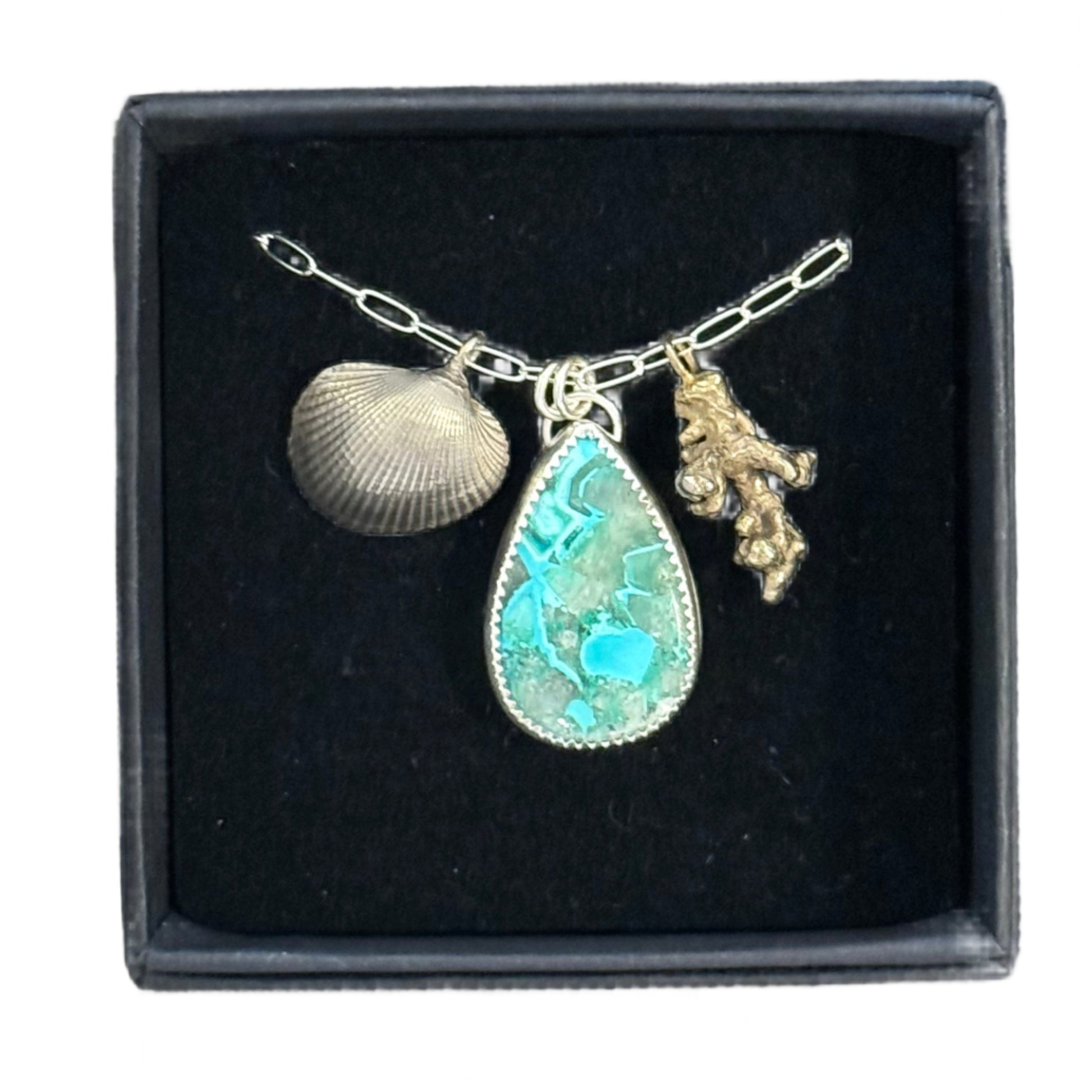A Chrysocolla malachite stone rests at the center of this charm necklace. The stone is set in fine silver atop a sterling silver backing. The charms on either side of the stone are a lost wax casting of a found shell and coral specimen, both of these are cast in white bronze. All three charms hang from sterling silver paper clip chain. Total length of necklace is 18" and is adjustable to be worn shorter if desired.