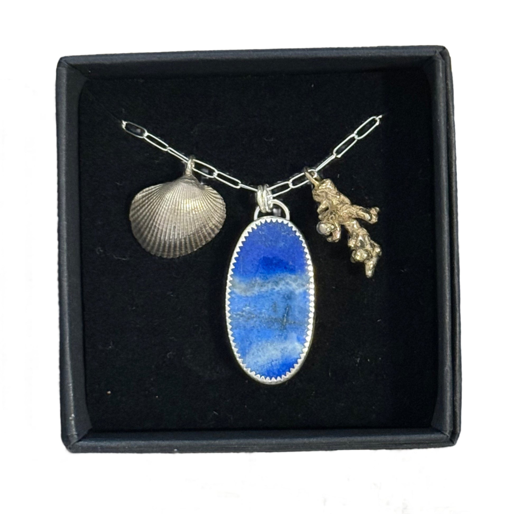 A Lapis Lazuli stone rests at the center of this charm necklace. The stone is set in fine silver atop a sterling silver backing. The charms on either side of the stone are a lost wax casting of a found shell and coral specimen, both of these are cast in white bronze. All three charms hang from sterling silver paper clip chain. Total length of necklace is 18" and is adjustable to be worn shorter if desired.