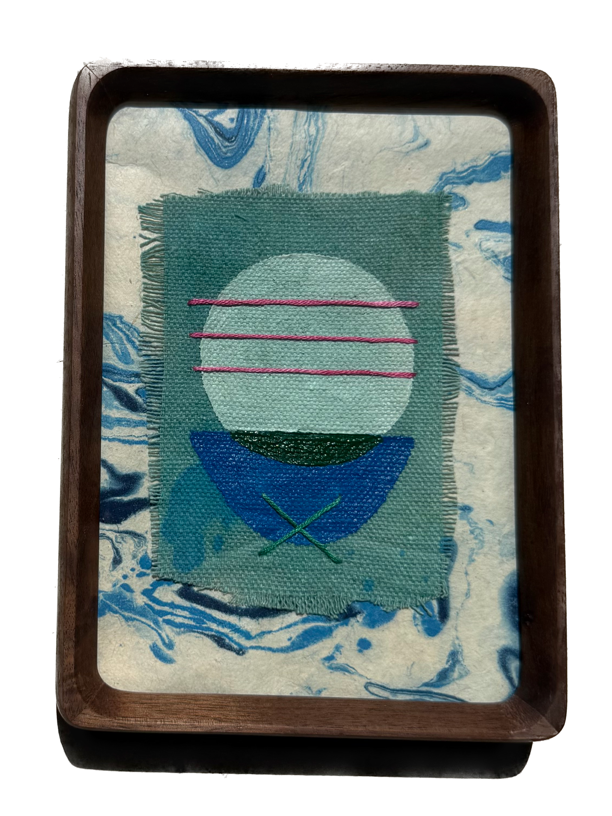 mixed media collage on dyed linen, embroidery