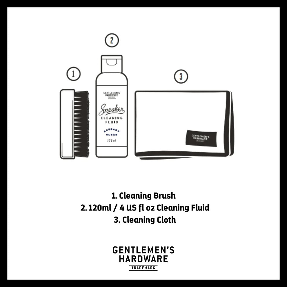 - Includes 120ml bottle of tough-on-stains cleaning fluid, cleaning brush and accompanying cloth