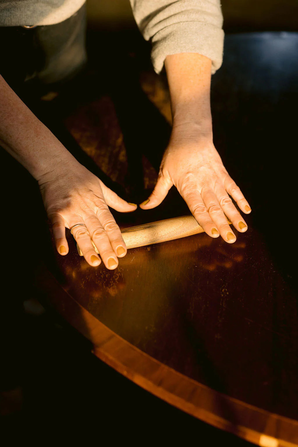 - mini rolling pin in sustainably harvested walnut in a USA made tube hand marbled with mineral pigment paints.